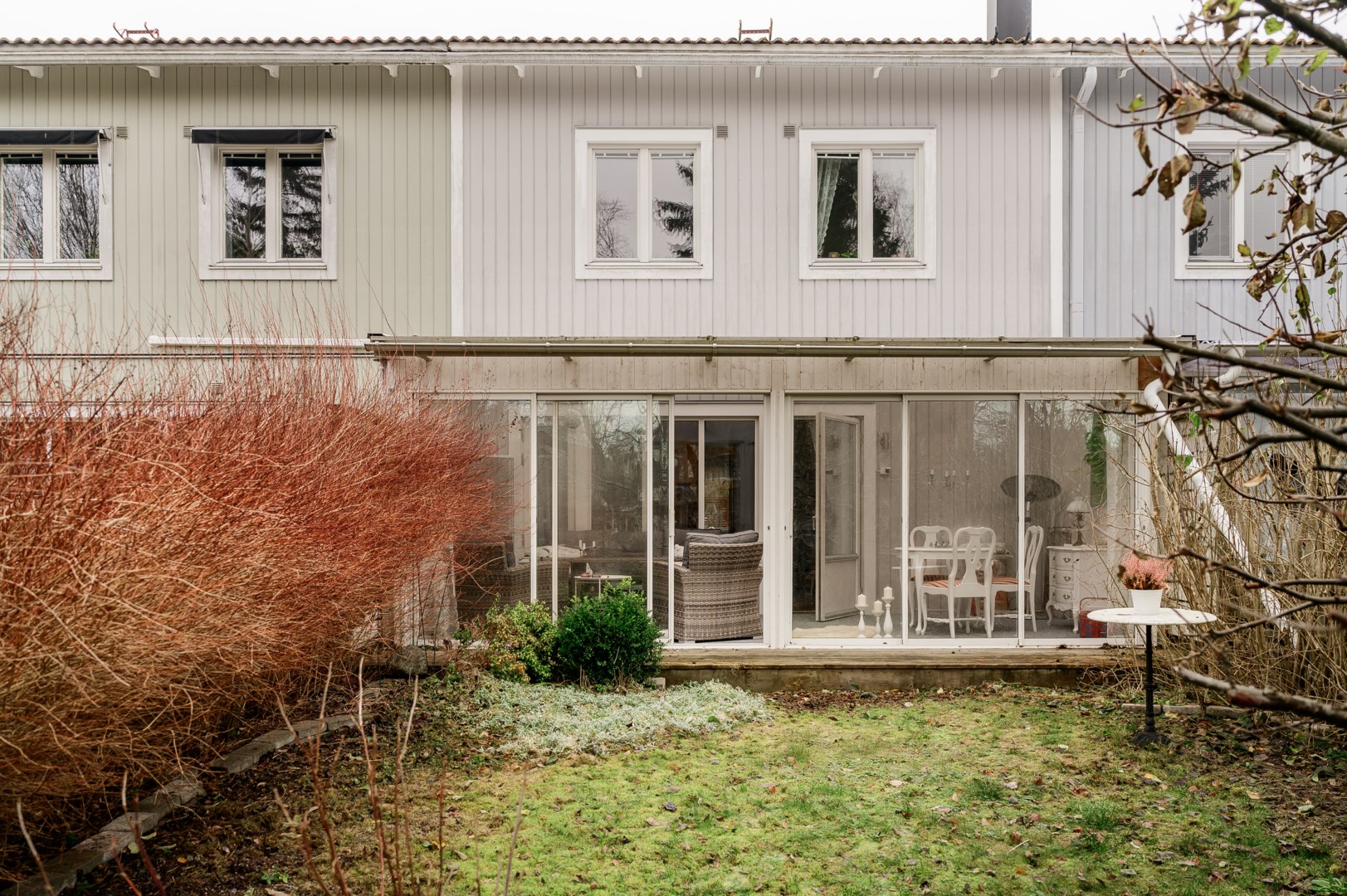 Huset har ett skyddat läge en bit in i området och omsluts av en uppvuxen trädgård och grönska på husets baksida där uterummet förlänger sommarkvällarna. Framsidan vetter mot sydväst, här njuter familjen av solen medan barnen leker på lekplatsen rakt utanför grinden.