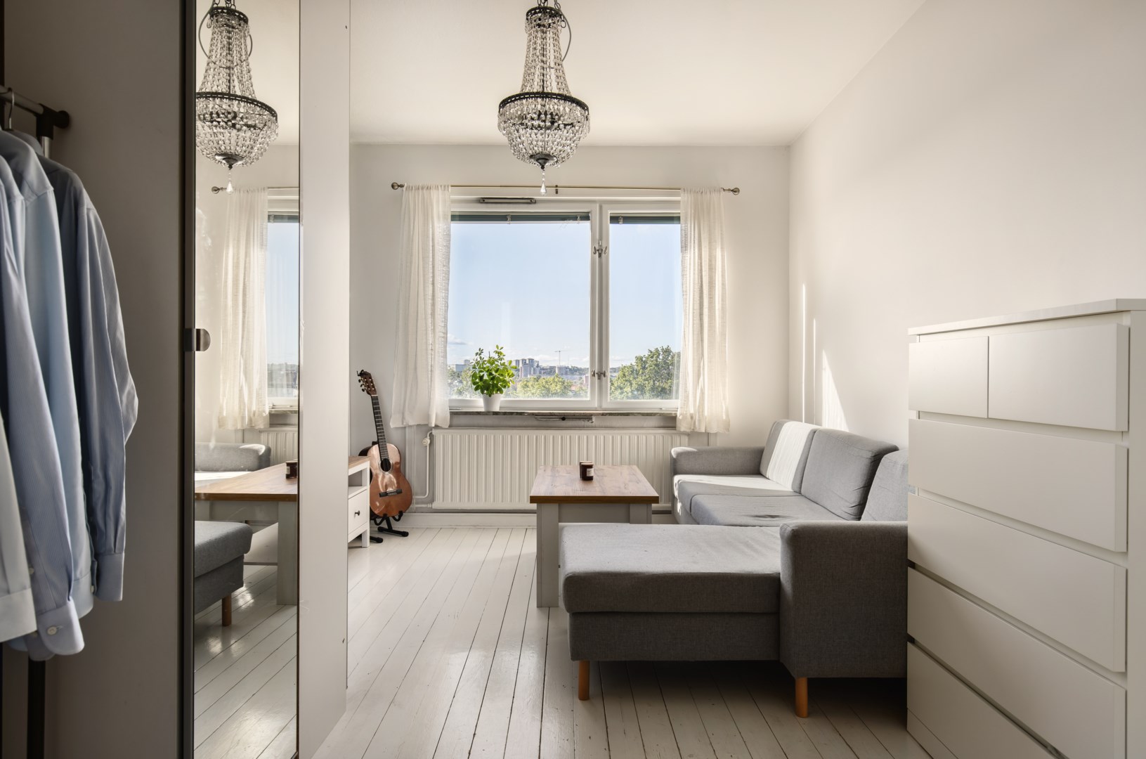 Lägenheten har ljusa fina trägolv som löper genom hela bostaden och stora fönster som släpper in rikligt med ljus. Från bostaden har du dessutom en fin utsikt – och du kan till och med skymta vattnet!