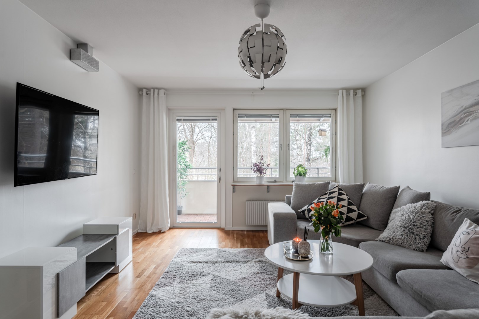 Planlösningen erbjuder hall med plats för avhängning, rymligt och stilrent kök med matplats, lättmöblerat vardagsrum med utgång till balkong mot skogsparti, två stycken sovrum samt klädkammare. Utöver detta finns ett badrum med badkar och fönster med vädringsmöjlighet.