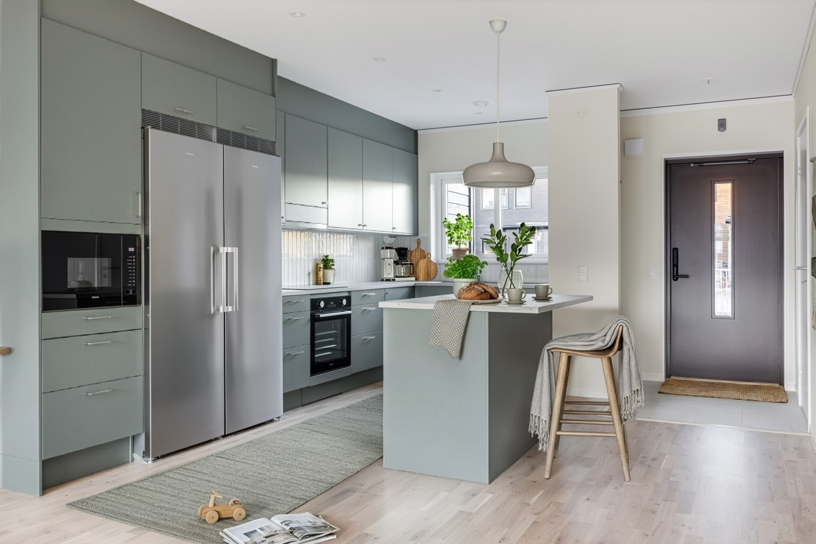 Kök och badrum kommer från Marbodal och är inredda i stilen Tall. Den är inspirerad av naturen och tallskogens nyanser. Perfekt för dig som vill ha en lika trendig och intressant stil som mjuk och sober.