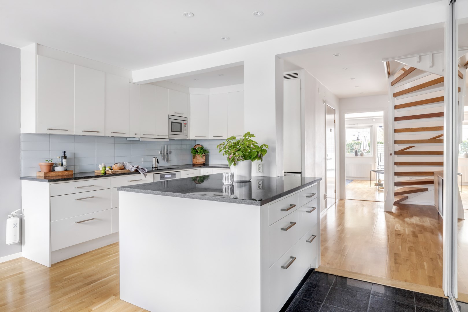 Entréplanet möts av en välkomnande hall med gott om förvaring. Köket med inredning från Ballingslöv är smakfullt inrett och har en stor, central köksö som skapar både arbetsyta och en naturlig samlingspunkt. Vardagsrummet har utgång till en solig altan med trädäck i sydvästläge – perfekt för umgänge och avkoppling. På framsidan av huset finns trivsamt altandäck och stenlagd uteplats omgiven av blomsterplanteringar och buskar. På detta plan finns också ett helkaklat badrum med dusch samt tvättmaskin och torktumlare.