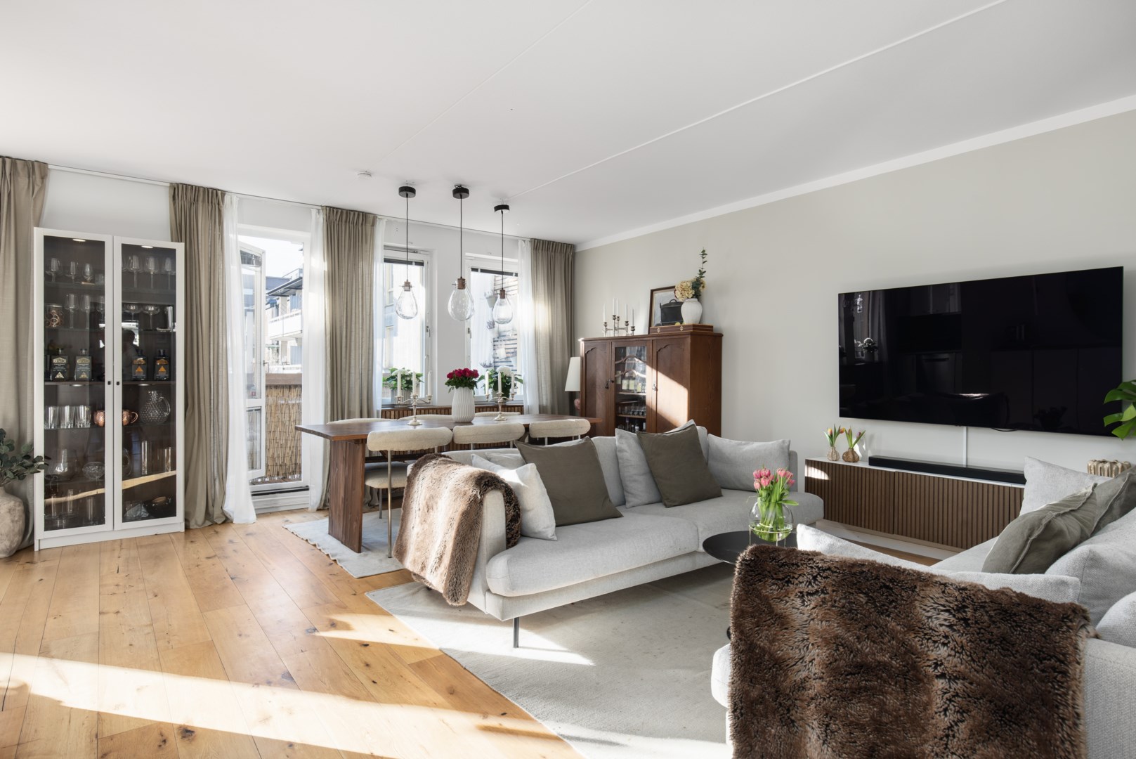 Här erbjuds en genomgående fin bostad med stilrena ytskikt och en öppen planlösning som förenar kök och vardagsrum i stora sociala ytor.