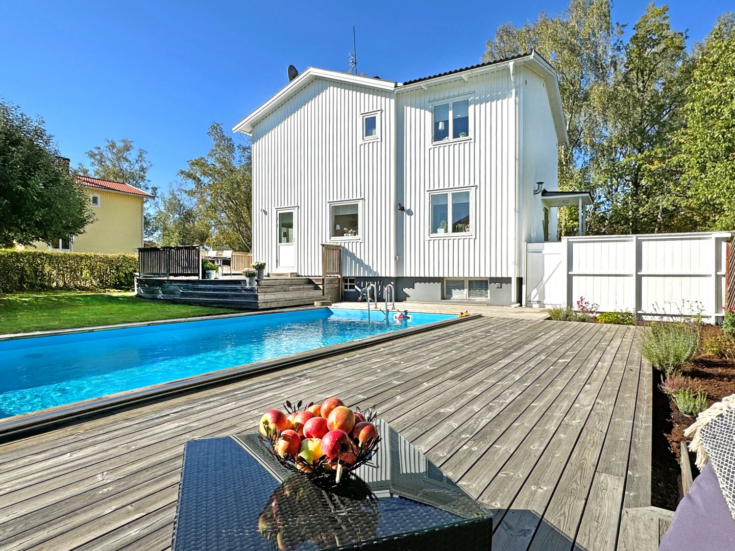 Den insynsskyddade plana tomten med ett utmärkt solläge är vackert anlagd med gräsmatta och trädäck runt den inbjudande poolen med utrymme för både solstolar och loungemöbler. Här finns plats för både lek och avkoppling.