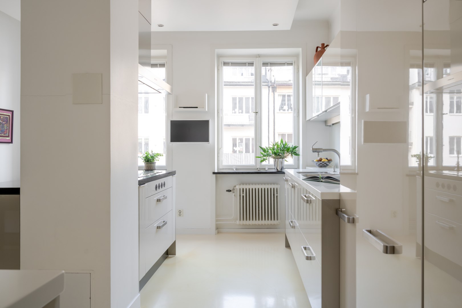 Köket är ett italienskt arkitektritat kök med full maskinell utrustning, köksö och gott om plats för matlagning och samvaro. Utsikten mot den gröna gårdsytan ger en rofylld kontrast till stadslivet. Från köket leder en passage till det andra badrummet, även detta helkaklat med klinker och golvvärme, utrustat med dusch, handfat och tvättmaskin.