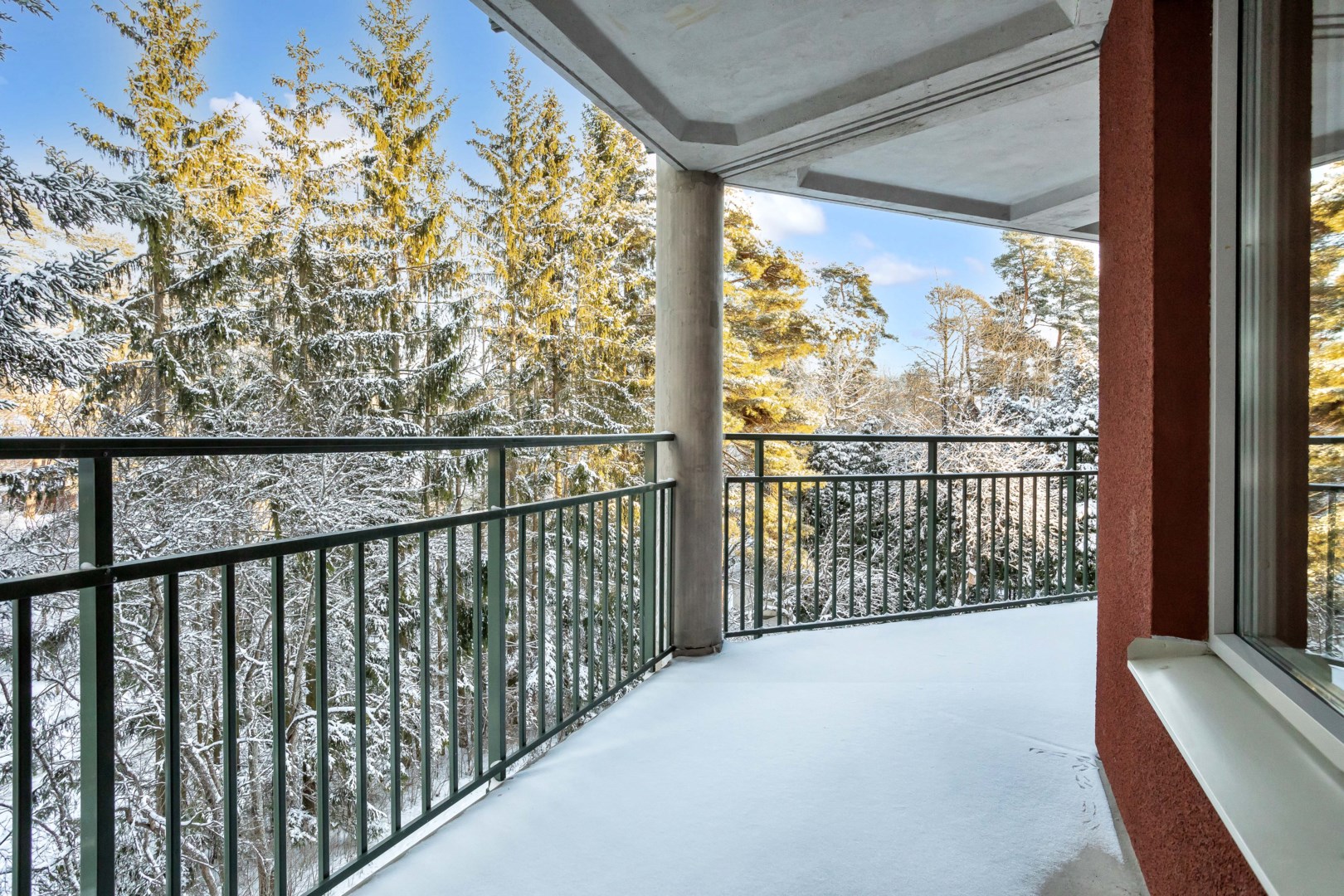 Vardagsrummet, som har direkt anslutning till köket, är en ljus och rymlig plats med stora fönsterpartier som släpper in rikligt med dagsljus. Härifrån når du också den rymliga balkongen, där du kan njuta av en fantastisk utsikt över den lummiga och gröna omgivningen – perfekt för en kopp kaffe i morgonsolen eller en trevlig middag under sommarkvällarna. Balkongen fungerar som en förlängning av vardagsrummet och skapar en harmonisk koppling mellan inomhus och utomhus.