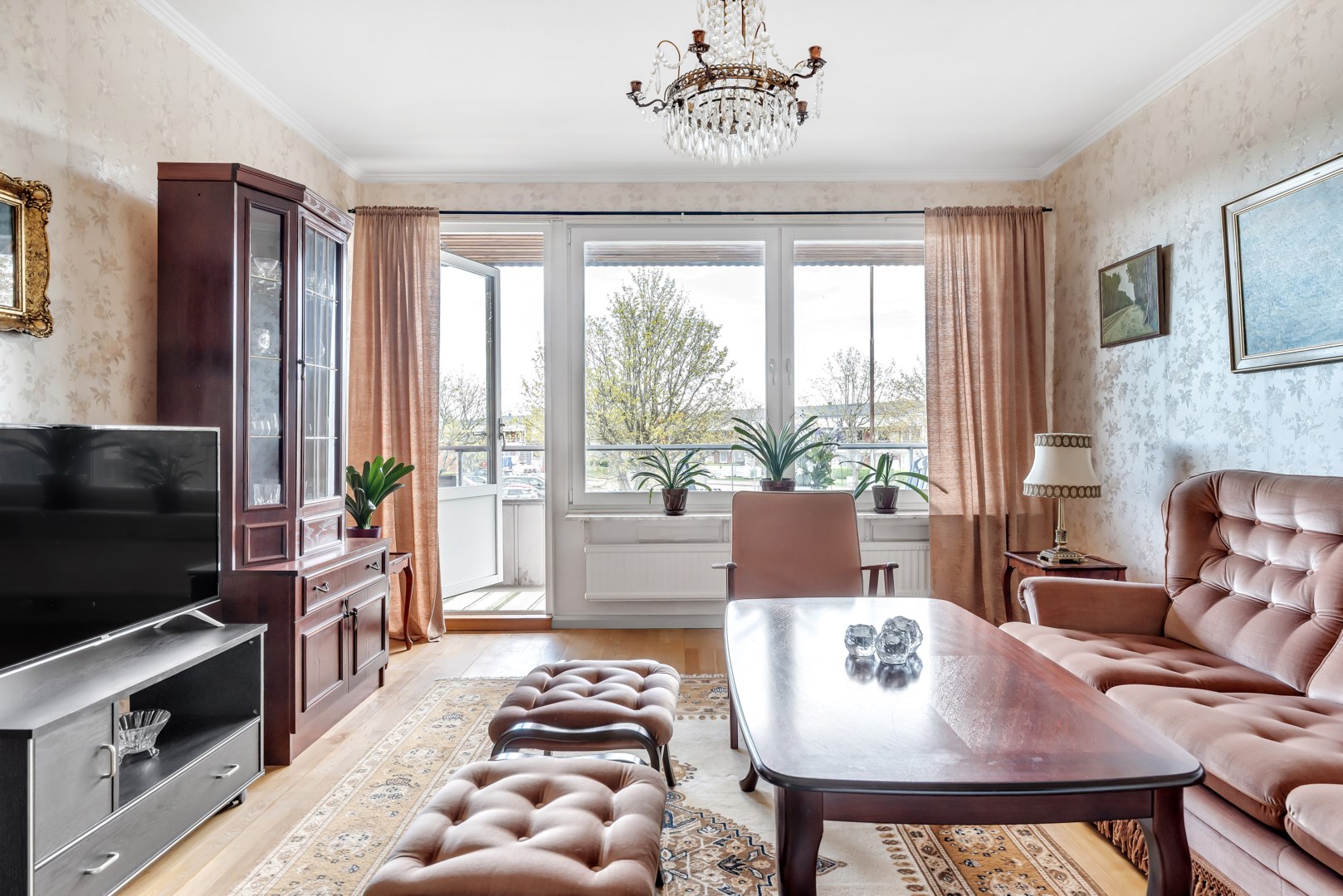 Lägenheten är belägen på andra våningen med fönster i två väderstreck, vilket skapar ett ljust och luftigt intryck. Planlösningen är både funktionell och hemtrevlig: från den rymliga hallen når du ett generöst vardagsrum med utgång till den stora balkongen i soligt österläge – perfekt för morgonkaffet i solen.
