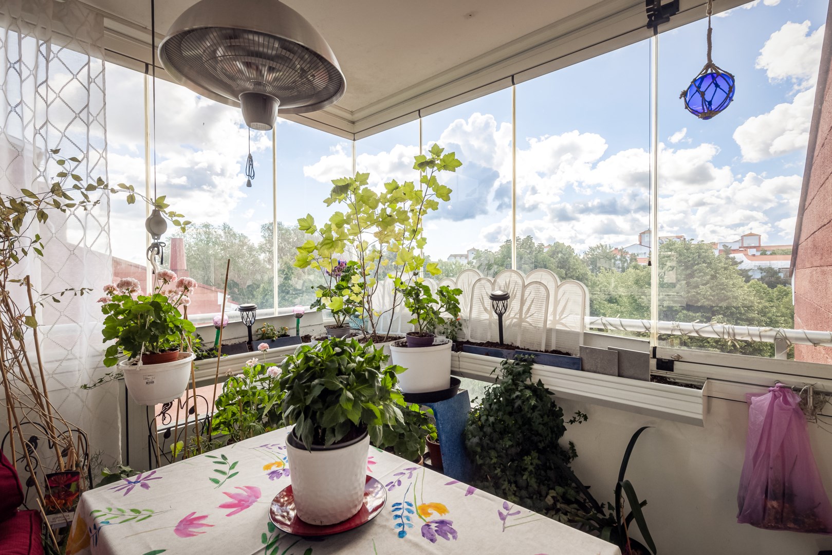 - Stor, solig inglasad balkong mot grönska