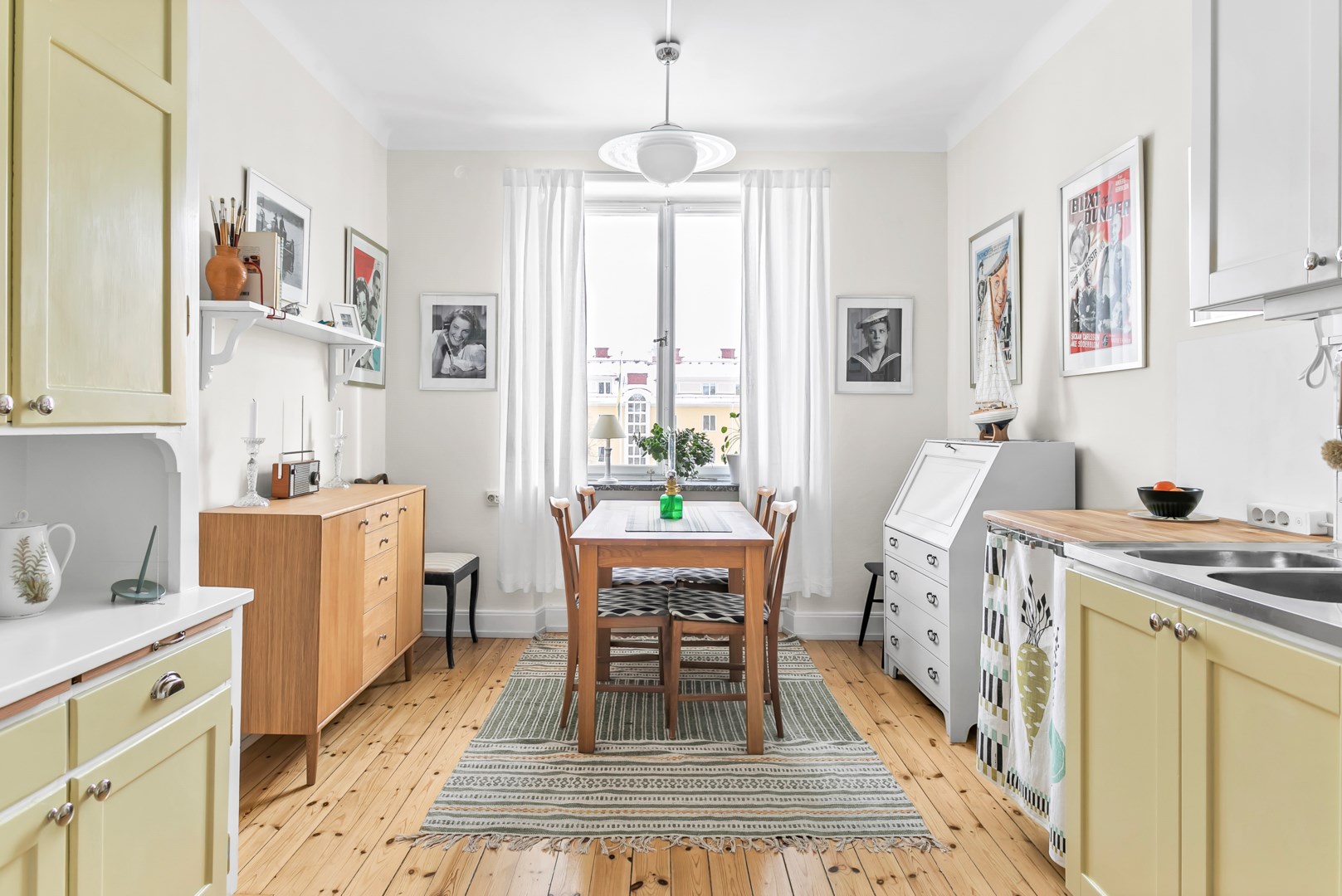 Här möts du av klassiska tidstypiska detaljer som skapar karaktär och hemtrevnad – högt i tak, vackra originalgolv i trä samt djupa fönsternischer med fina beslag. Lägenheten erbjuder en välkomnande hall med plats för avhängning, ett större kök med gott om förvaring bland annat i ett charmigt serveringsskåp, ett ljust och luftigt vardagsrum med plats för både soffgrupp och matbord samt ett smakfullt stamrenoverat duschrum/WC.