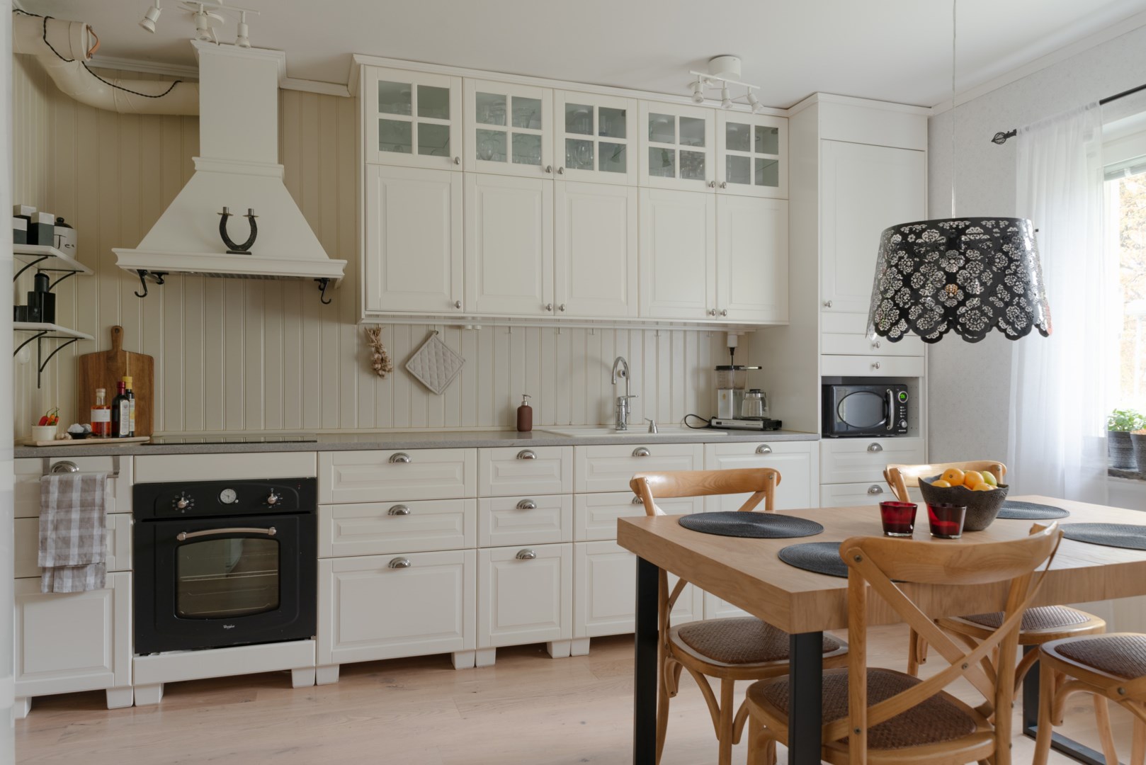 När du kliver in möts du av en välkomnande hall med gott om förvaringsmöjligheter i generösa garderober. Det nyligen renoverade köket har vita, stilrena snickerier, plats för matgrupp och en charmig etanolspis som ger extra atmosfär.