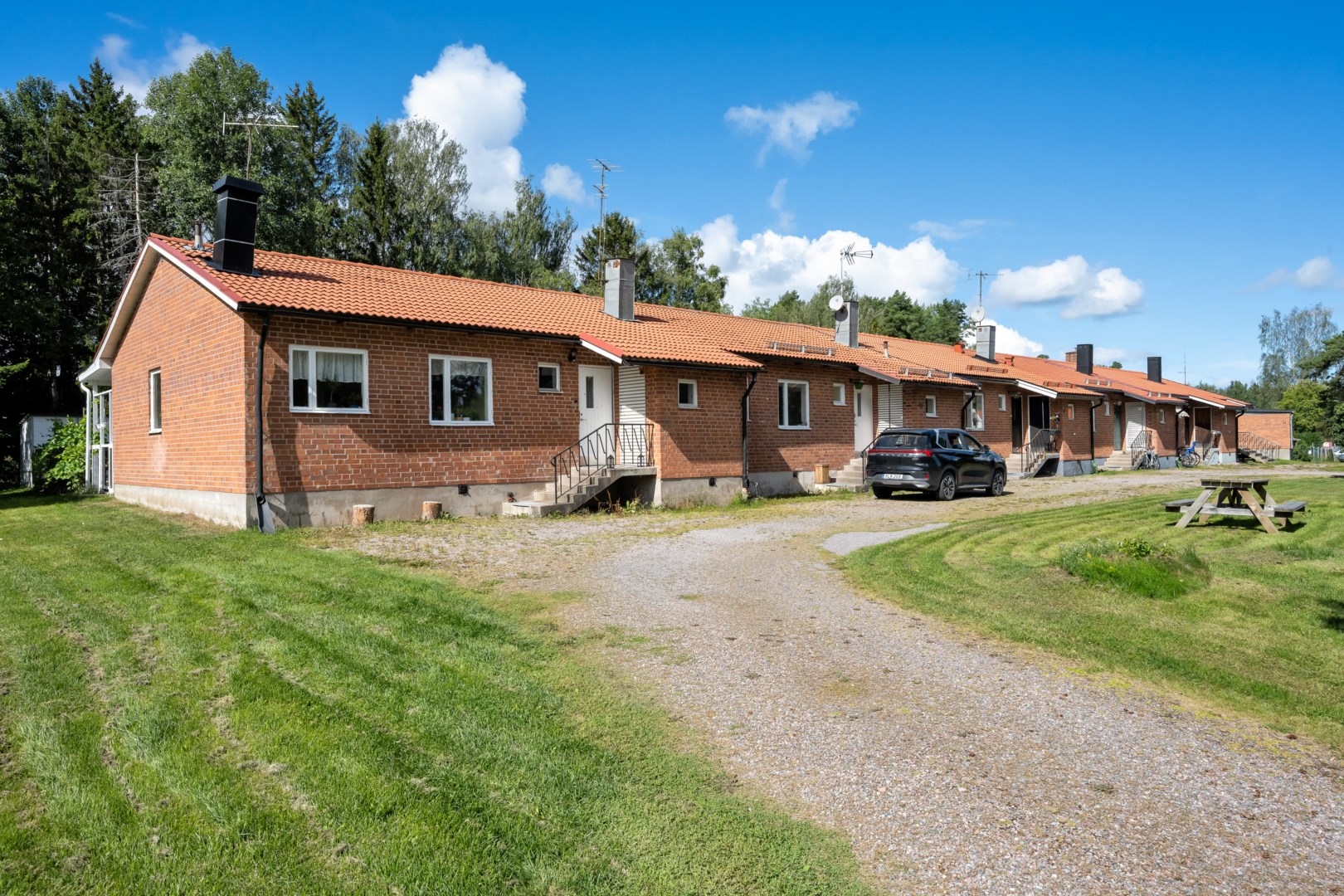 På framsidan finns bilparkering, medan baksidan bjuder på gräsmatta och en trivsam altan under tak.