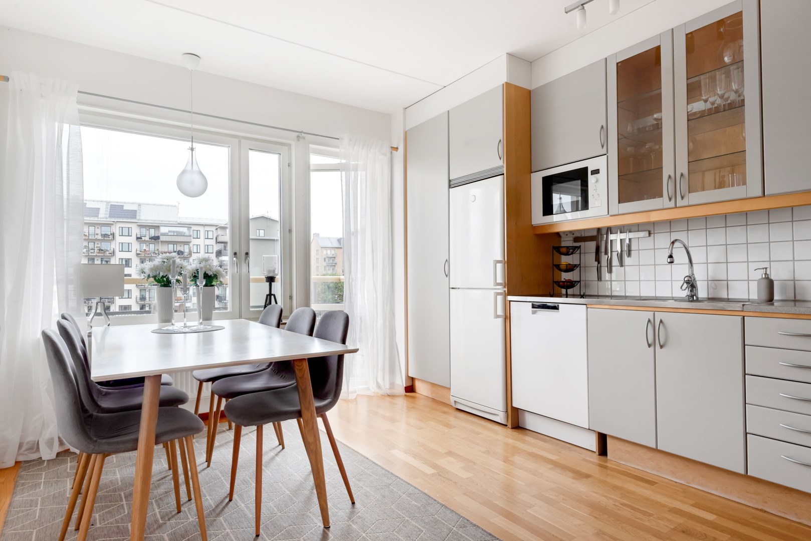 När man kliver in möts man av en välkomnande hall med goda förvaringsmöjligheter i en rymlig klädkammare. Vardagsrummet är ljust och luftigt, med direkt utgång till den större balkongen där man kan njuta av solen under större delen av dagen. Här finns även två rymliga sovrum med gott om garderober. Köket är fullt utrustat och erbjuder en generös matplats samt utgång till den mindre balkongen – perfekt för morgonkaffet. Vidare finns ett fräscht badrum med tvättpelare (tvättmaskin och torktumlare) samt en separat gäst-WC.