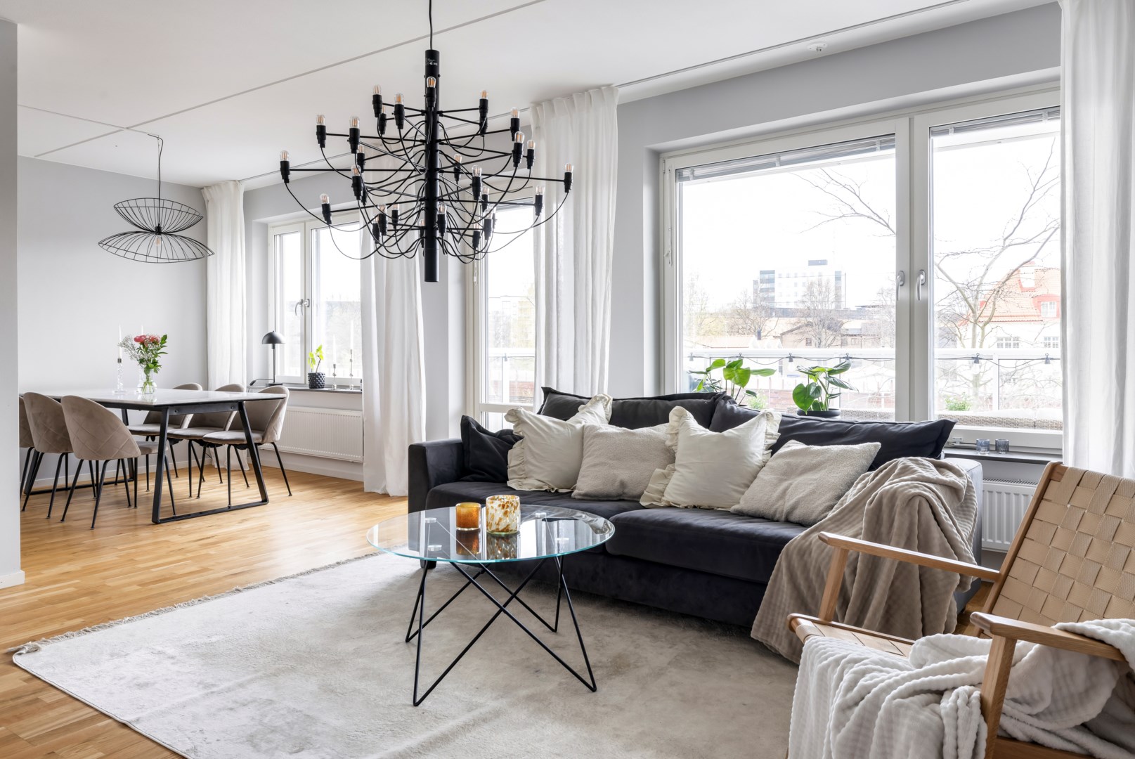Lägenheten präglas av ett fint ljusinsläpp och en inbjudande atmosfär där kök och vardagsrum samspelar på ett naturligt sätt. Här finns gott om utrymme för både soffgrupp och matplats, vilket gör det enkelt att samla familj och vänner. Matplatsen är strategiskt placerad vid fönsterpartiet och rymmer flera gäster, vilket förstärker den sociala känslan i hemmet. Från vardagsrummet nås den rymliga balkongen som fungerar som en förlängning av bostaden under årets varmare månader.