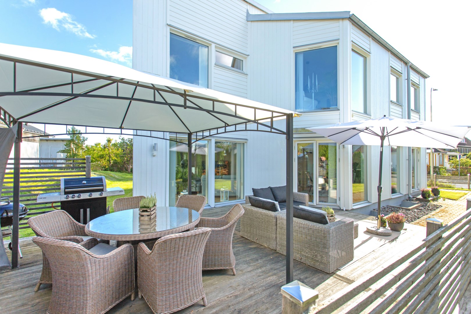 Mellan köket och vardagsrummet finns en rejäl matplats för 8-10 personer - även här finns en utgång till den trädäckade uteplatsen av lärk.