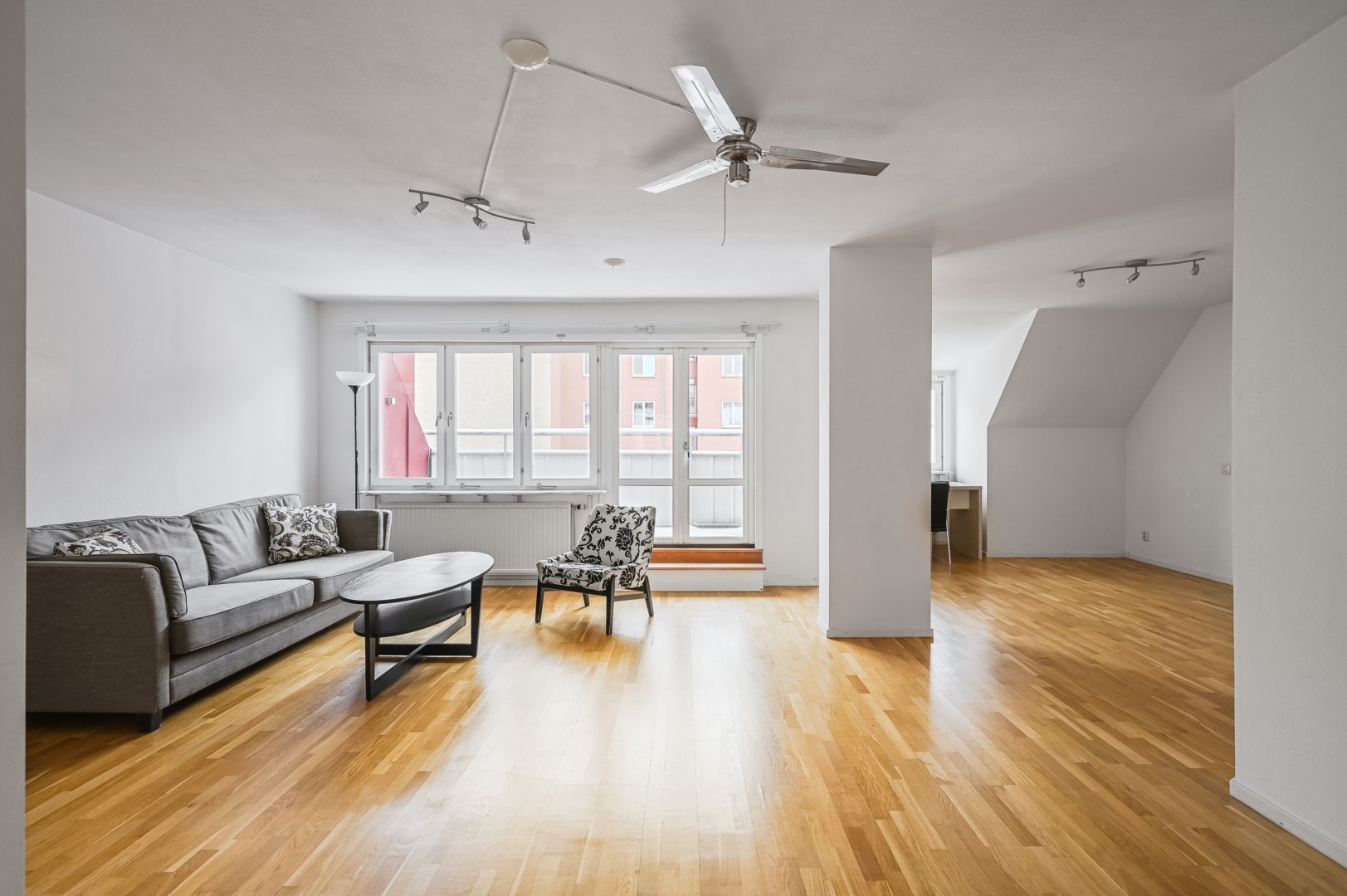 Välkommen till denna unika lägenhet om 143 kvm, belägen högst upp i huset på ett våningsplan som du har helt för dig själv! Här finns många möjligheter att anpassa planlösningen efter dina behov, inklusive en potentiell uthyrningsdel som kan göras om till en separat 1:a eller 2:a med egen ingång.
