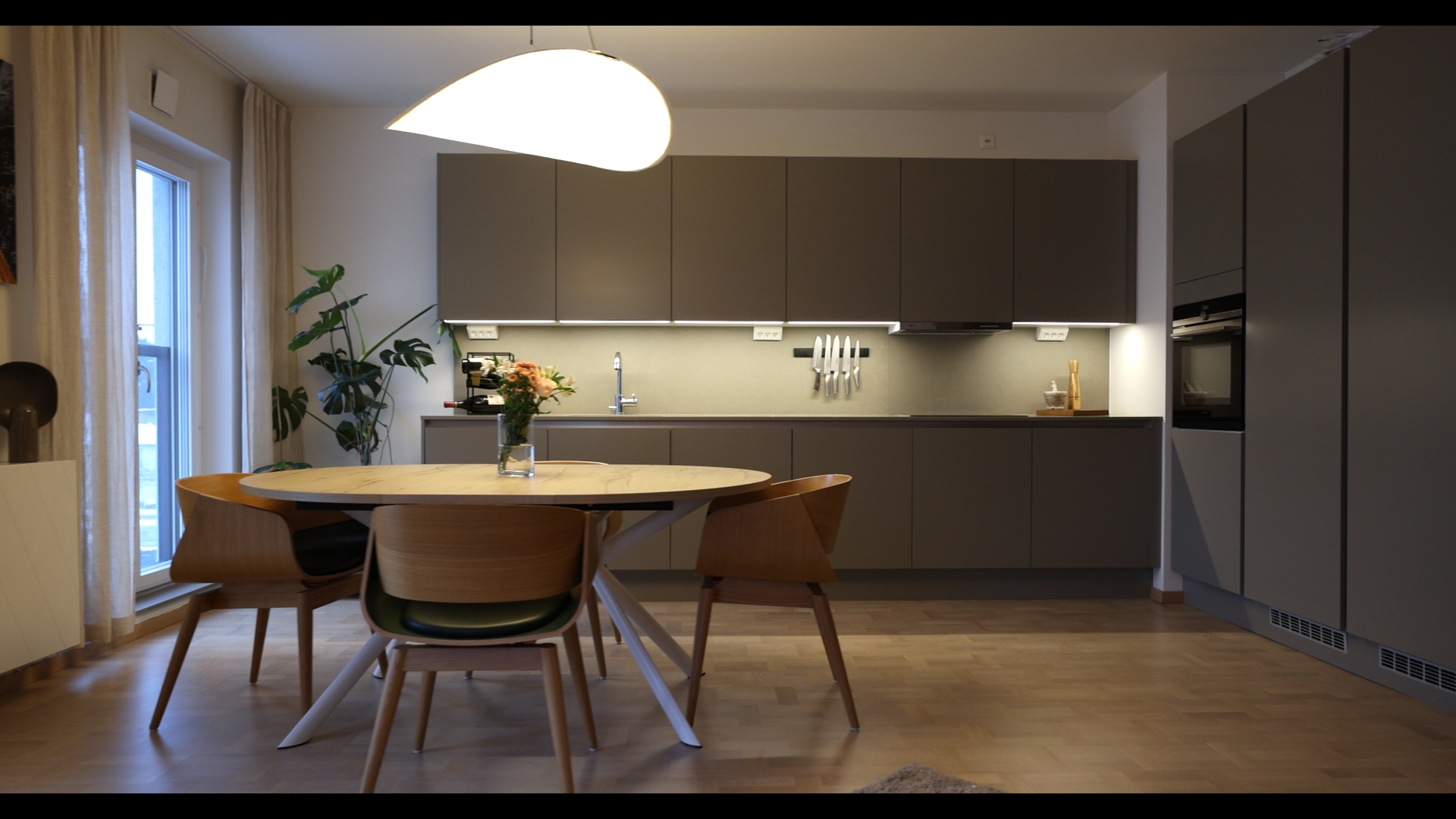 Öppen planlösning mellan kök och vardagsrum som enkelt möbleras med soffgrupp och matbord i storlek större. Köket är försett med all maskinell utrustning som behövs samt gott om arbetsyta och god förvaring i de flera under- och överskåpen. Lägenheten har tre välplanerade sovrum där Master Bedroom är försedd med platsbyggda garderober runt sängen. Intill Master Bedroom ligger lägenhetens andra sovrum där båda två har utgång till lägenhetens stora balkong mot den lugna innergården och sol hela dagen. Lägenhetens tredje sovrum ligger i andra änden av lägenheten. Båda badrummen håller högsta standard med en riktigt lyxig hotellkänsla. Båda badrummen är försedda med WC och dusch och det större badrummet har även två kombinerade tvättmaskin/torktumlare bakom luckor i samma färg som överskåpen, med en arbetsbänk emellan dem. Rymlig hall bakom säkerhetsdörr med gott om förvaring och avhängningsmöjligheter. Genomgående håller bostaden högsta standard med genomgående, vattenburen golvvärme under den vackra enstavsparketten, stora fönsterpartier med djupa fönsternischer, digitalt lås och bekvämlighet som garage i huset samt ett externt förråd.