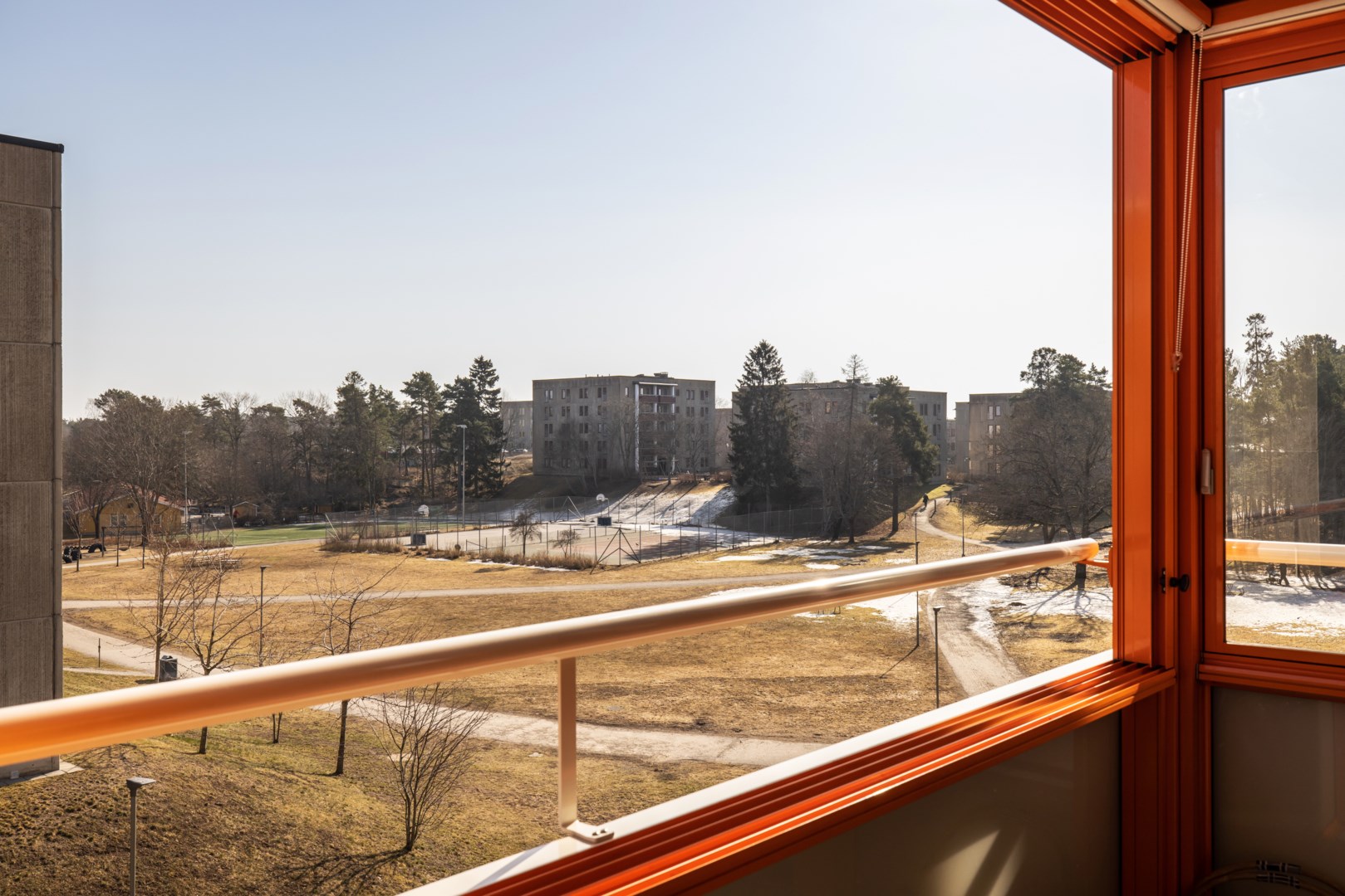- Stor inglasad balkong med utsikt över grönska