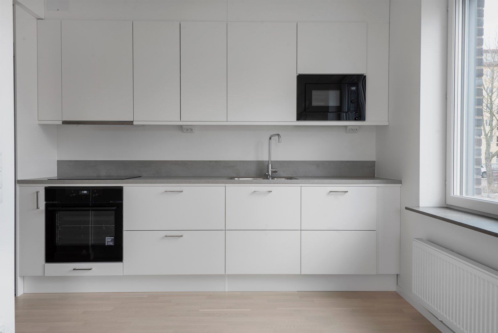 Köket är funktionellt och välutrustat med kyl/frys, induktionshäll, ugn, mikro och diskmaskin, samt god förvaring i skåp och lådor. Här finns även plats för matbord. Vardagsrummet erbjuder gott om utrymme för soffgrupp, tv-möbel och ytterligare möblering, med ett fint ljusflöde från två håll som ger rummet en trivsam karaktär.