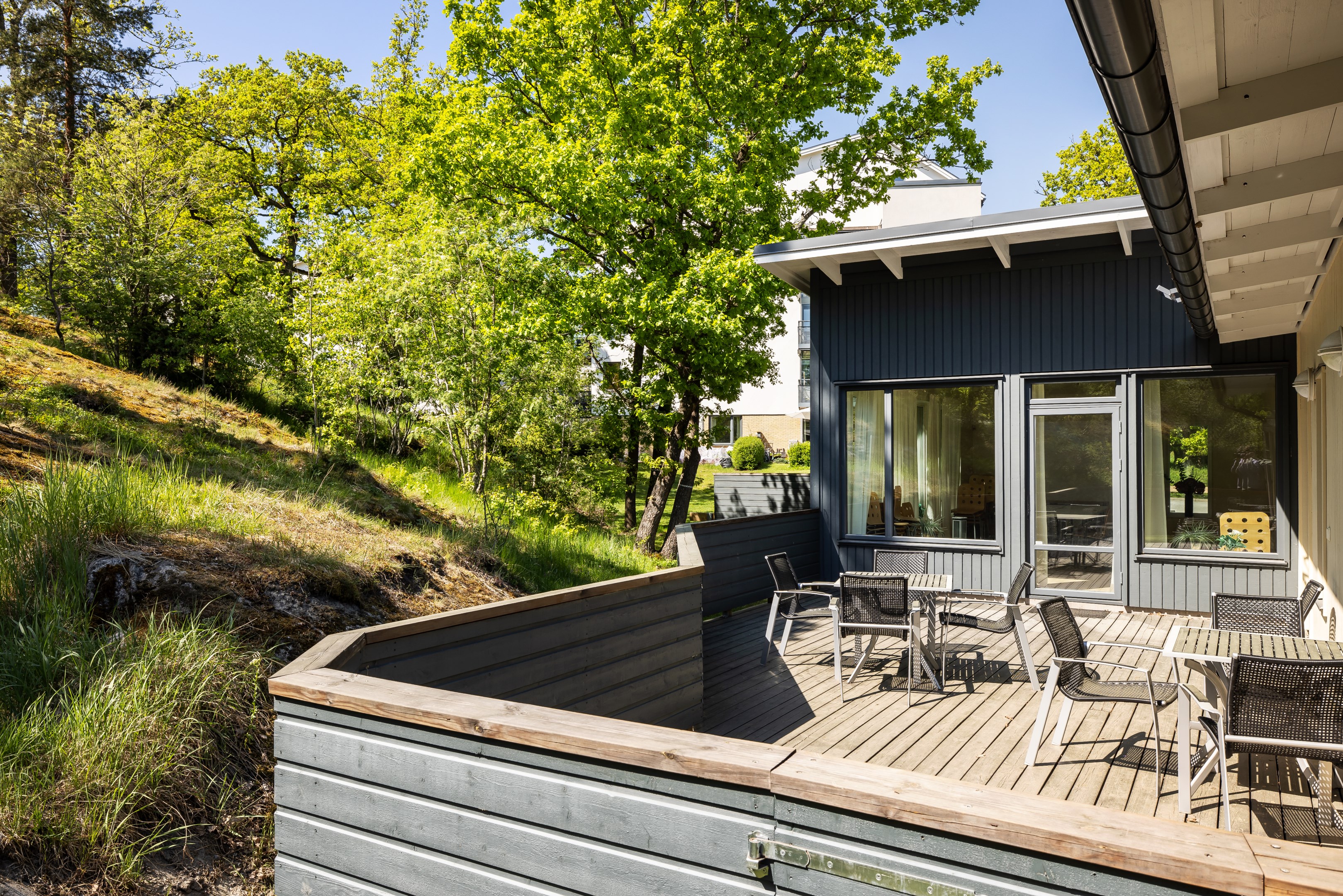 Bostaden har en inbjudande och genomtänkt planlösning med stora ytor och trivsam fördelning mellan vardagsrum- och kök. Vardagsrummet är ljust och luftigt med generösa ytor vilket ger möjlighet att möblera efter vad som passar dig. Köket är stilrent med vita fronter som matchar de ljusa vitvarorna tillsammans med de svarta beslagen som passar till kaklet. Här erbjuds breda matlagningsytor med belysning i överskåpen, gott om plats för köksförvaring och en bra yta för matbord med plats för familj och vänner. Köket har en halvöppen planlösning gentemot matplats och vardagsrum, på så sätt slipper du se eventuell disk samtidigt som ljuset fortsätter att flöda fritt. Sovrummen är uppdelade och ligger i varsin ände av lägenheten, det större intill hallen och det mindre intill vardagsrummet. I det stora sovrummet får du enkelt plats med dubbelsäng med tillhörande sängbord och garderober. Sovrummet intill vardagsrummet funkar perfekt för barnet eller som kontor. Här finns en rymlig klädkammare intill med generöst utrymme för förvaring. För den som önskar är det möjligt att göra om matplatsen till ytterligare ett sovrum, och tack vare den stora ytan i vardagsrummet har du plats för både soffgrupp och matbord, se alternativ planlösning. Badrummet är helkaklat med vitt kakel mot grått klinkergolv och har all utrustning du behöver för att trivas. Från köket går du ut till den härliga balkongen med exklusiv inglasning och vackert nåtat skeppsgolv i massiv ek. Den går att nyttja en större del av året och ger en förlängd känsla av bostaden med bra yta för loungegrupp och grillmöjligheter. Här strålar solen fint redan från tidig lunch fram till solnedgång. Njut i gott sällskap med fin vy över trädtoppar och område i fritt läge.
