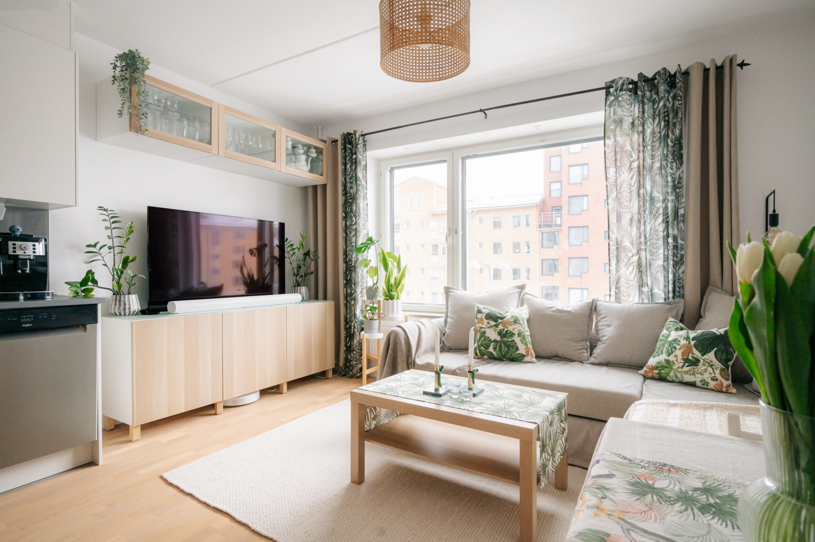 Det sociala vardagsrummet badar i ljus och bjuder in till såväl lugna hemmakvällar som middagar med vänner. Planlösningen binder samman rummen på ett naturligt sätt, där köket är utformat för smidig matlagning och sovrummet erbjuder en rofylld plats för återhämtning, avskilt från sällskapsytorna.
