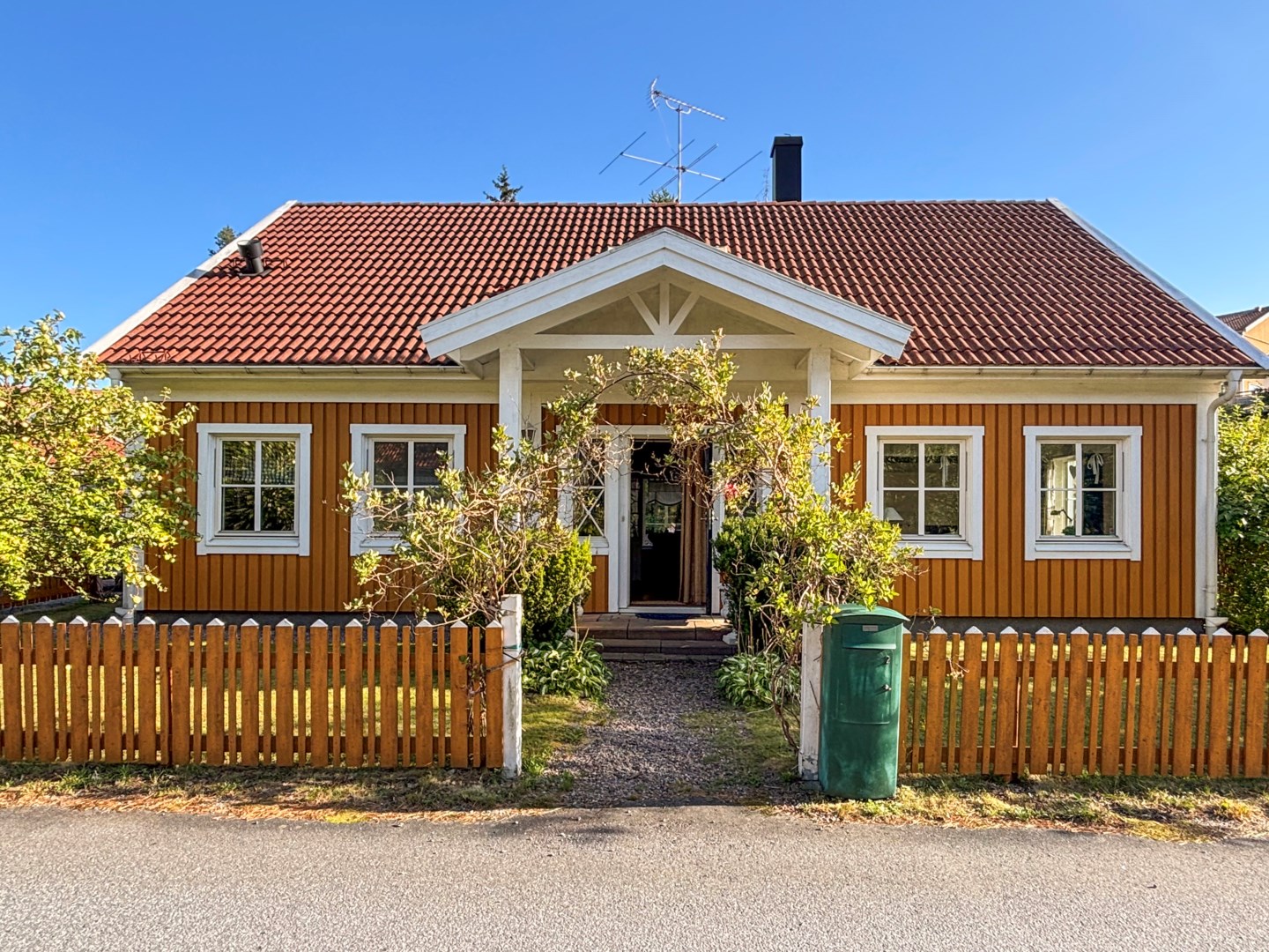 Hemmet välkomnar med en rymlig och ljus hall med dubbel takhöjd som binder samman rummen på entréplanet. Mot trädgården i bakkant vetter ett stort vardagsrum med generösa fönsterpartier och en trivsam braskamin. Det charmiga köket i klassisk stil ligger i fil och har plats för matbord. På detta plan finns även ett större sovrum med ett fantastiskt ljus tack vare tre fönster, utmärkt som gästrum eller föräldrasovrum. Både köket och hallen är helt nymålade i ljusa färger. Badrummet är stilfullt i ljusa nyanser och får fint ljusinsläpp via ett fönster. Tvättstugan har egen ytterdörr mot villans gavel och fungerar perfekt som vardagsentré från parkeringen – en praktisk lösning för leriga overaller och barn i farten.