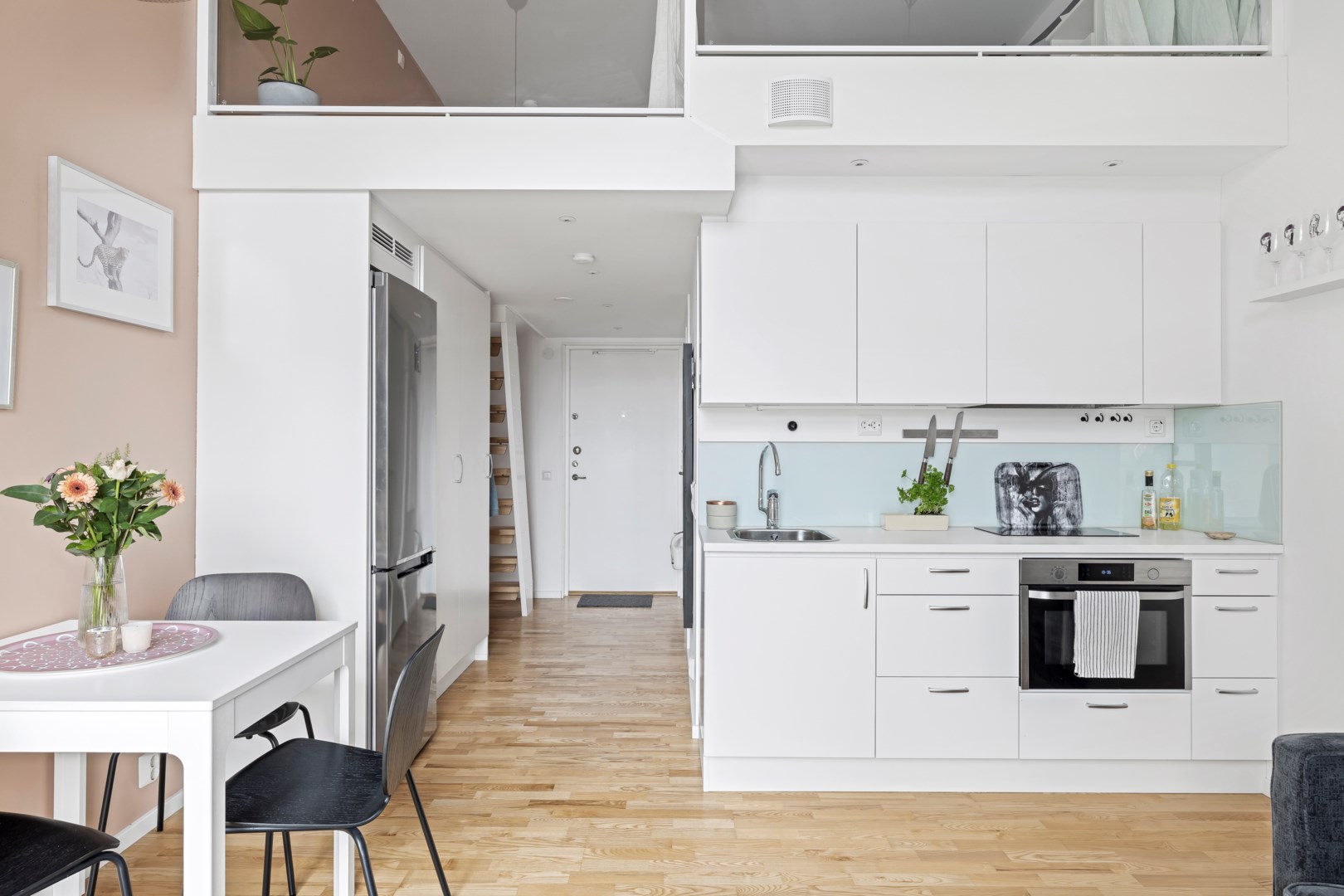 Planlösningen erbjuder hall med plats för avhängning och förvaring i två garderober. Rymligt och modernt badrum med kombinerad tvättmaskin/torktumlare. Vardagsrummet har ett stort fönsterparti som medför ett fint ljusinsläpp. Kök med vita köksluckor med öppen planlösning mellan kök och vardagsrum. Vidare finns trappan upp till sovloftet med plats för stor säng och bra förvaring.