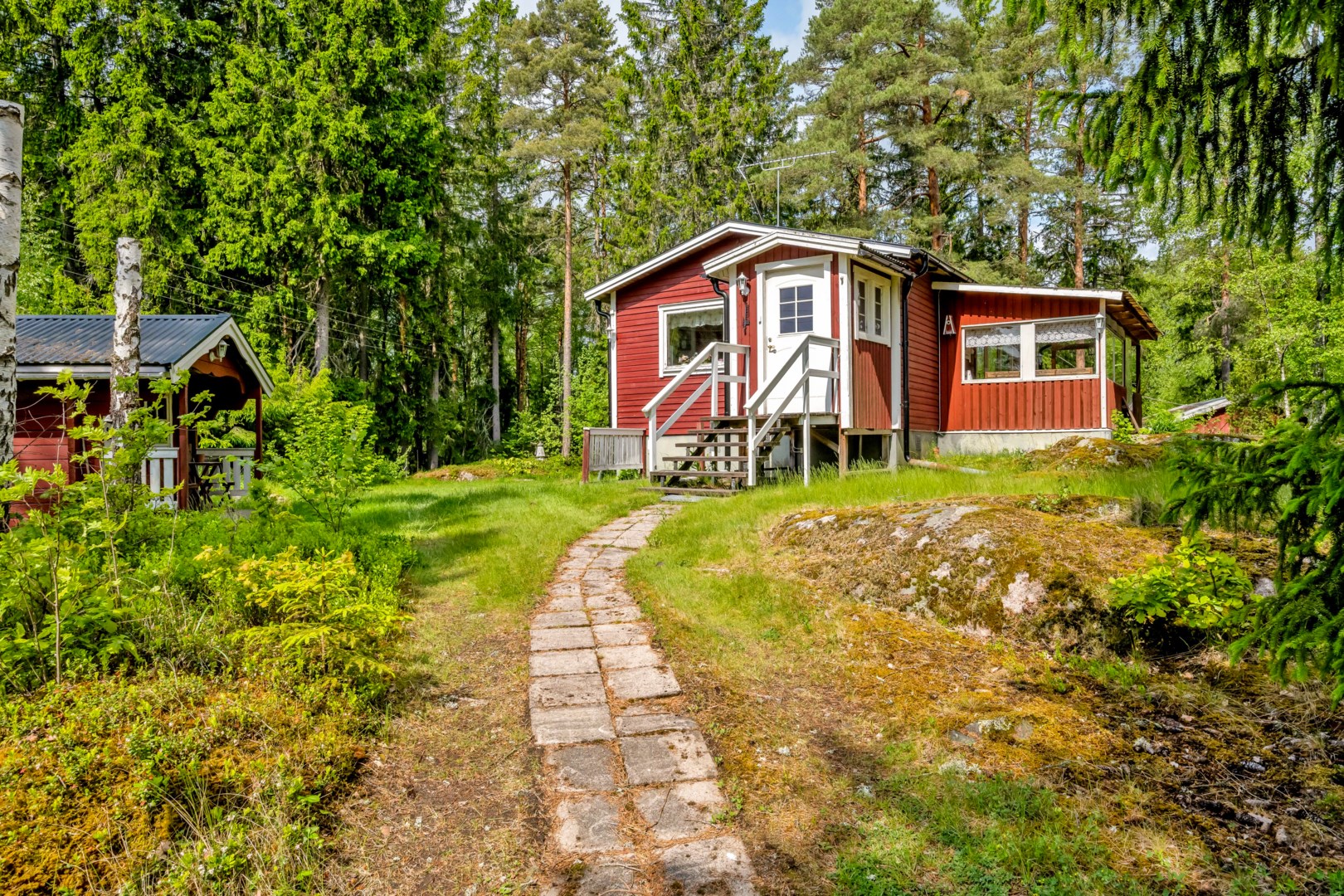Röd sommarstuga med farstukvist och närhet till bad, båt och barfotadagar