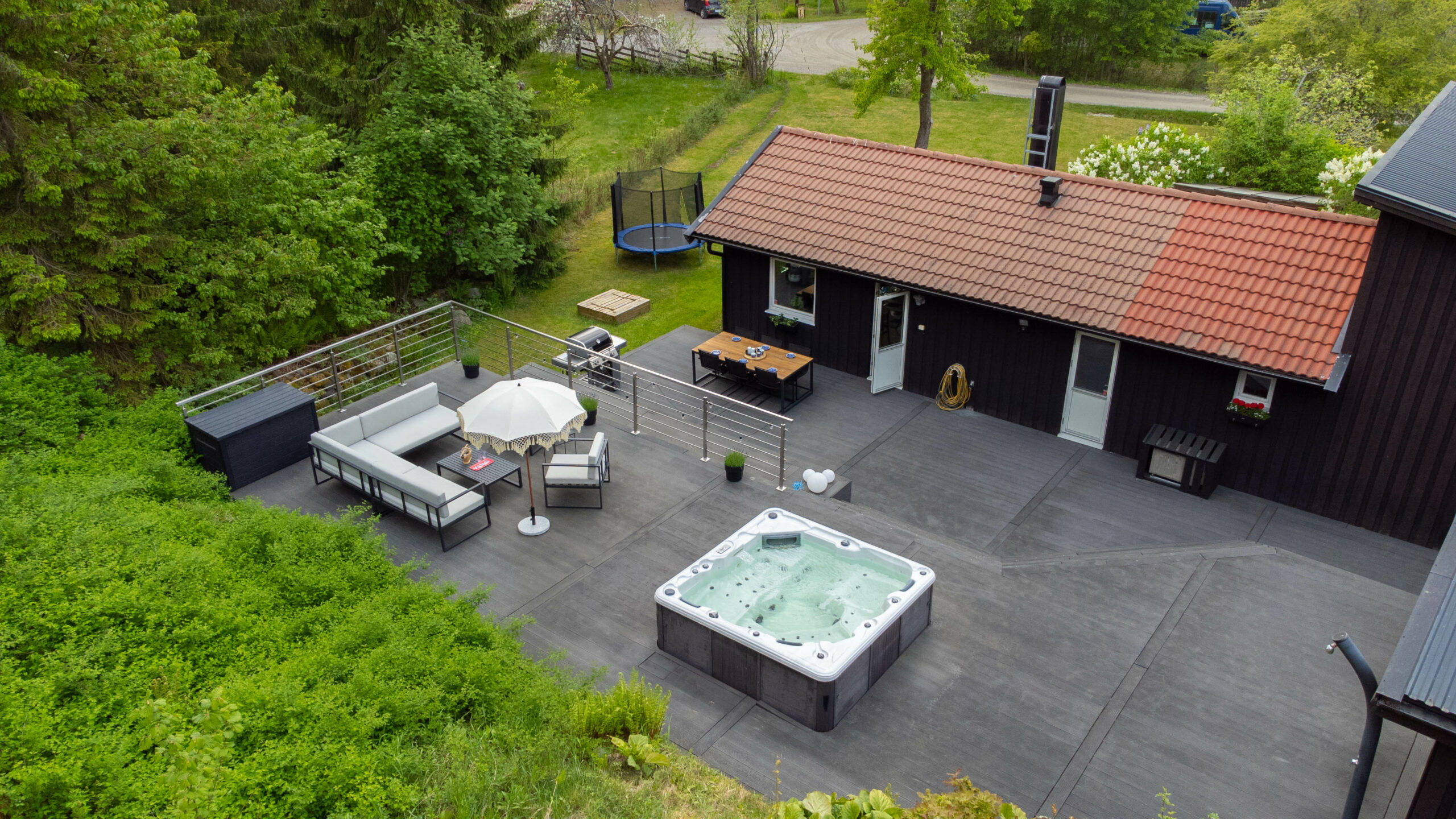 Nuvarande hus är mycket fräscht och välplanerat - det upplevs betydligt större än sina 75 kvm tack vare att varje kvadratmeter är på rätt ställe, ljusinsläppet är rikligt och takhöjden är god. Skicket är genomgående mycket gott då stora delar är renoverat de senaste åren. Den enorma terrassen som ligger mellan huset och berget bakom blir som ett stort extra vardagsrum sommarhalvåret. Här samlas man gärna för att grilla eller bada i spabadet. I anslutning finns också ett större gästhus om ca 30 kvm som innehåller två delar: dels en mycket stor och lyxig bastu och dels ett gästhus med egen ingång - ett utmärkt extra sovrum eller hemmakontor.