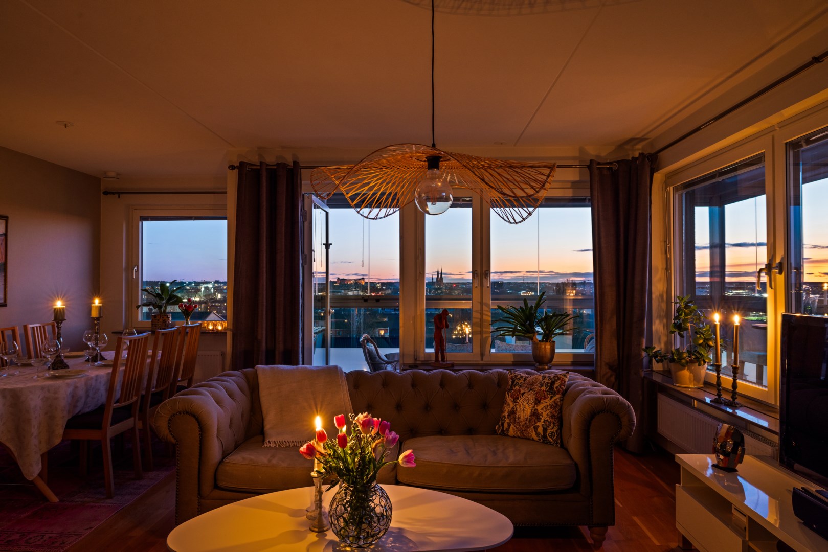 Den generösa vinkelbalkongen, elegant inglasad för maximal användning året om, blir en förlängning av vardagsrummet och ger dig en privat oas att njuta av morgonkaffet eller magiska solnedgångar. Oavsett årstid bjuder denna vy på en levande tavla av stadens skiftande ljus och färger.