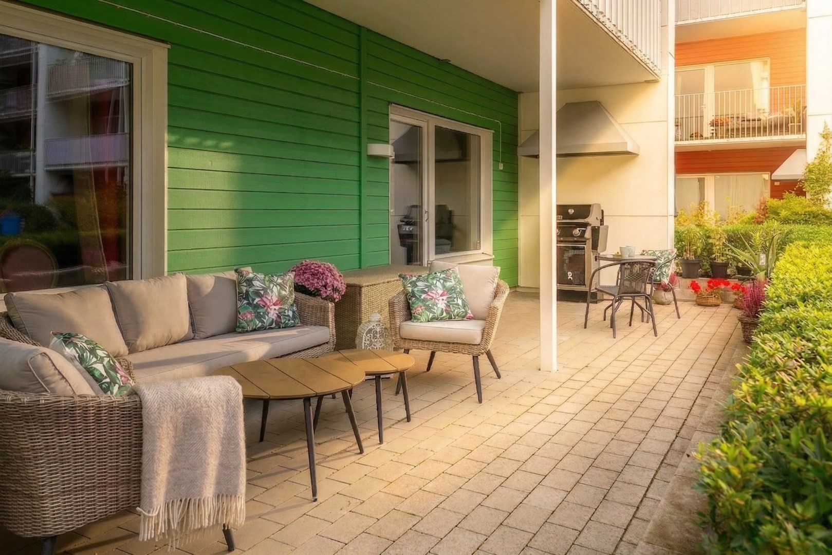 Från vardagsrummet nås lägenhetens få förunnade uteplats. Här väntar ett riktigt extra vardagsrum utomhus. Enorm i storlek och med gott om plats för både loungemöbler, stor matgrupp och kvalitetsgrill från Weber med ventilation! En perfekt plats för sommarens alla stunder, från middagar med vänner till sköna kvällar i loungen.