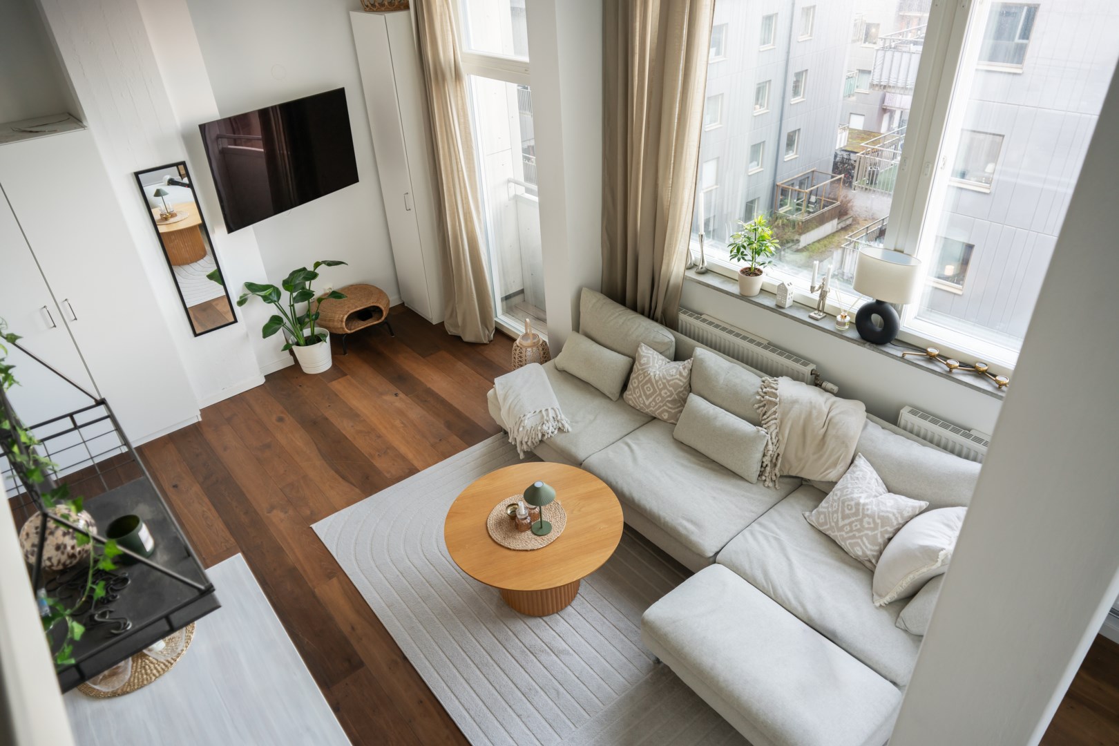 Redan när du kliver in möts du av en luftig och inbjudande känsla där den imponerande takhöjden tillsammans med de höga fönsterpartierna skapar ett fantastiskt ljusinsläpp. Den öppna planlösningen mellan kök och vardagsrum ger en social och trivsam miljö – perfekt för både vardag och umgänge. Köket är stilrent och snyggt med en massiv mattslipad bänkskiva i granit, trendiga köksluckor i vitt och grått, integrerad diskmaskin och maskinpark i rostfritt stål. Det separata sovrummet rymmer dubbelsäng och förvaring, avskilt från sällskapsytorna vilket ger en lugn och privat atmosfär. En trappa upp nås bostadens sovloft, en mysig och avskild plats som lämpar sig perfekt som sovdel för barnen. Loftet ger dessutom möjlighet till ytterligare möblering såsom arbetsplats eller förslagsvis läshörna. Badrummet är helkaklat och utrustat med med behaglig golvvärme, tvättmaskin och torktumlare, duschvägg i glas, handdukstork och en snygg kommod. Praktisk hall med hatthylla och flera garderober.