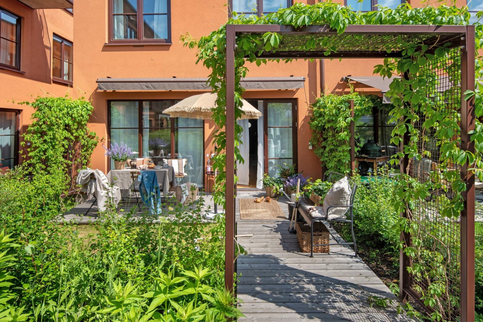 Uteplatsen fungerar som ett extra vardagsrum och ramas in av uppvuxen grönska. Blir solen väl påträngande så skänker markisen skugga. Trädgården öppnar upp mot föreningens gemensamma ytor där barnen kan röra sig fritt mellan husen.