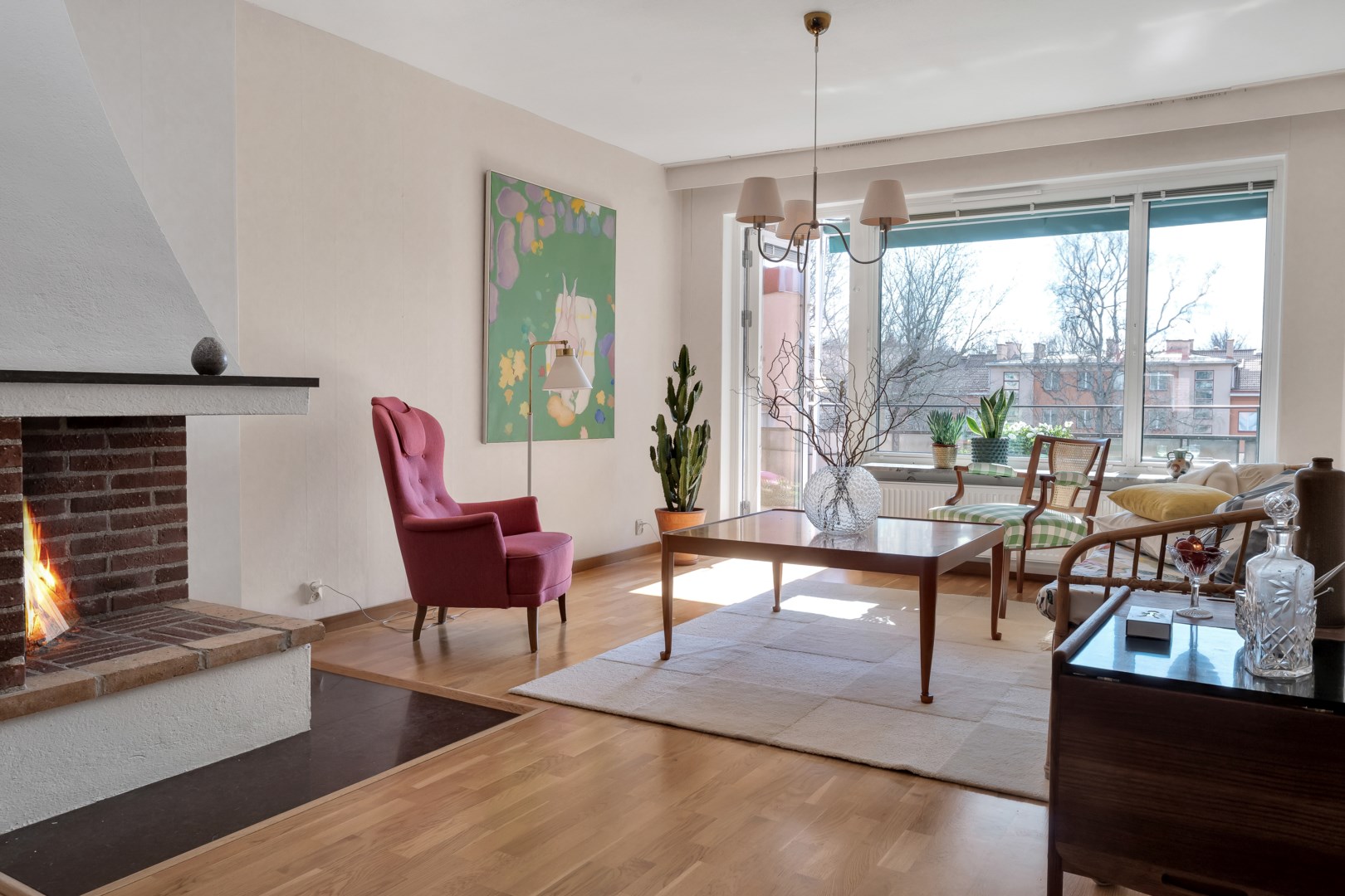 Välkomna till ett hem med ett härligt ljusflöde och generösa sociala ytor, perfekt för både vardagsliv och umgänge. Vardagsrummet är rymligt, lättmöblerat och trivsamt, med högt i tak och vackra parkettgolv. Den öppna spisen blir en naturlig samlingspunkt där ni kan njuta av sprakande brasor och som skapar en varm och ombonad känsla, medan fönstren i två väderstreck släpper in rikligt med ljus. Från vardagsrummet når ni balkongen i sydvästläge med utsikt mot innergården och eftermiddags- och kvällssolen.