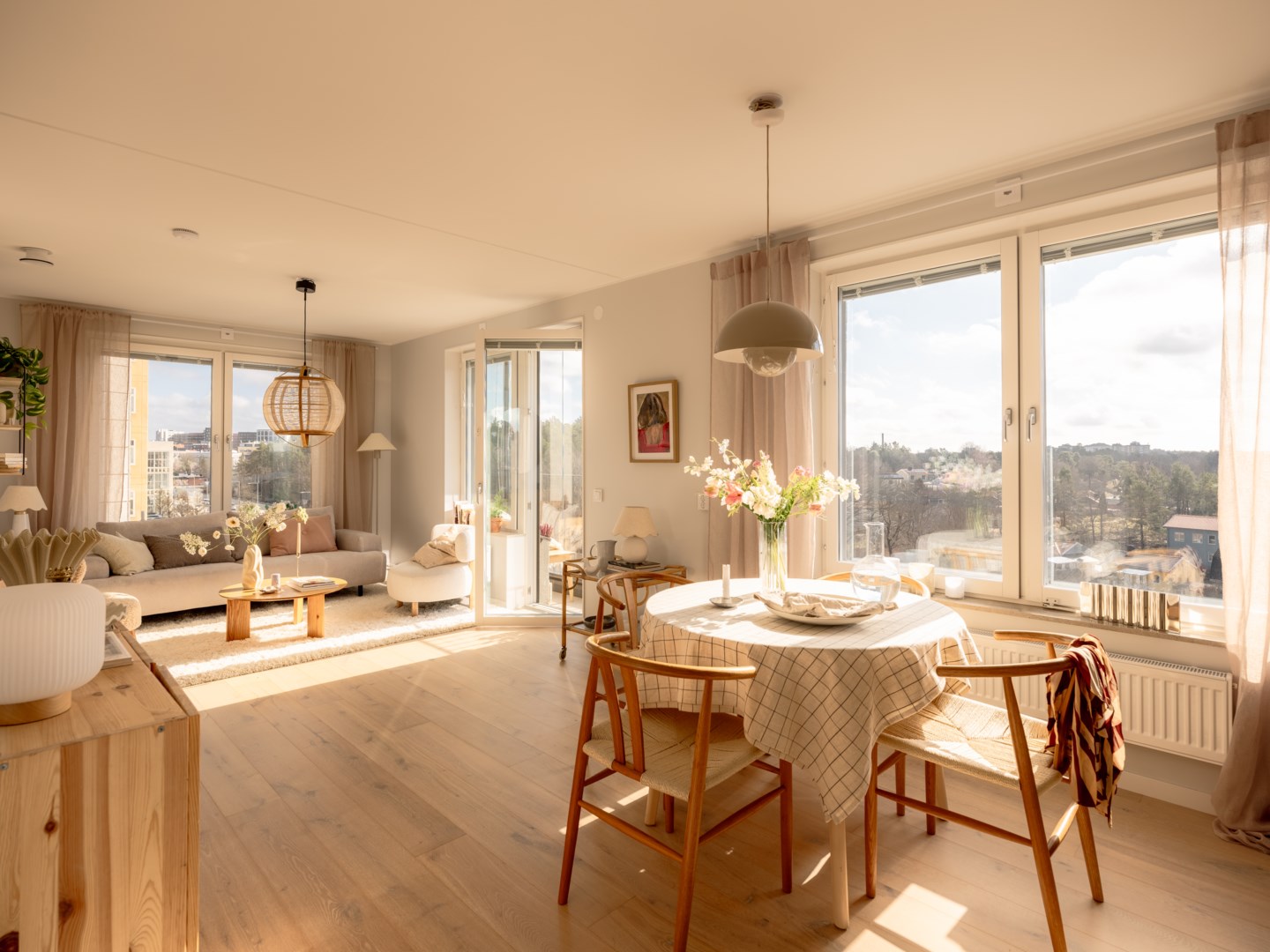 Högst upp i huset väntar en modern och stilren 2:a om 46 kvm med solig balkong i söderläge och en helt ostörd panoramavy över grönska och Hökmossens villaområde. Den genomgående enstaviga ekparketten, ljusa väggarna och det generösa ljusinsläppet från två väderstreck skapar en luftig och harmonisk atmosfär.