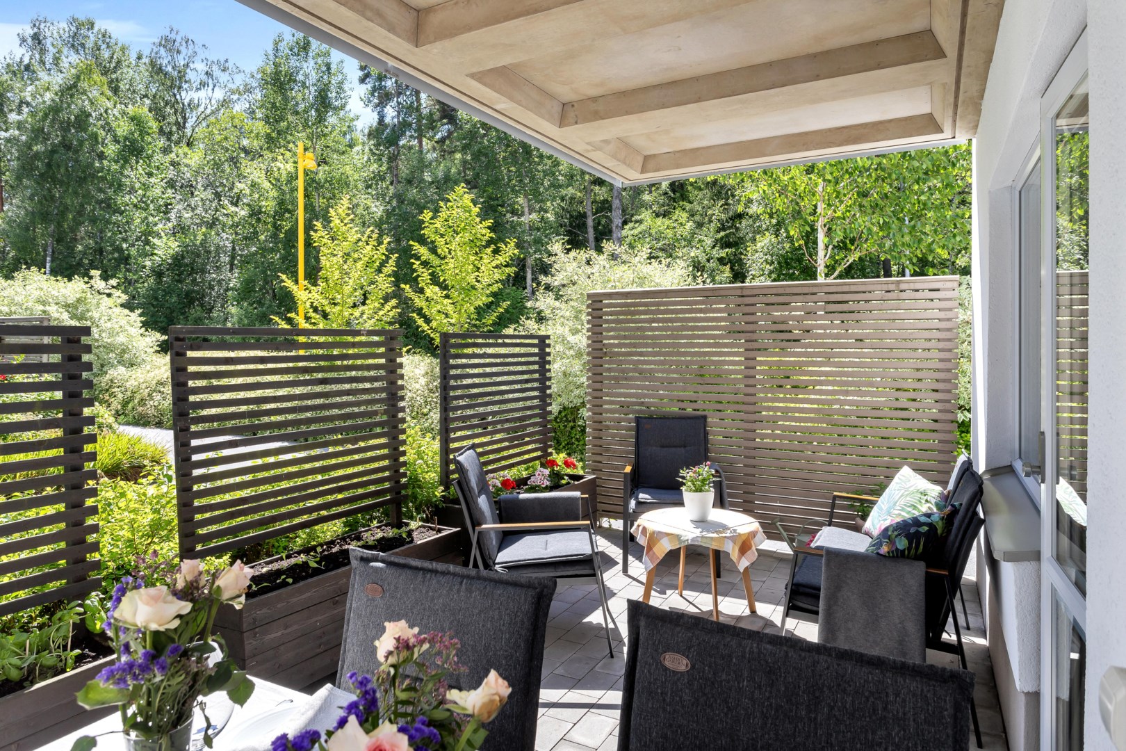 Bostaden har en attraktiv planlösning med halvöppet mellan kök och vardagsrum, stort badrum med tvättavdelning samt två separata sovrum i bra storlek. Köket har gott om förvaring, full maskinell utrustning och en ordentlig matplats. Det stora sovrummet har gott om plats för dubbelsäng och bra förvaring i garderobsvägg. Det lättmöblerade vardagsrummet har utgång till den stora uteplatsen, som har ett ljust söderläge och gott om plats för både matgrupp och loungemöbler.