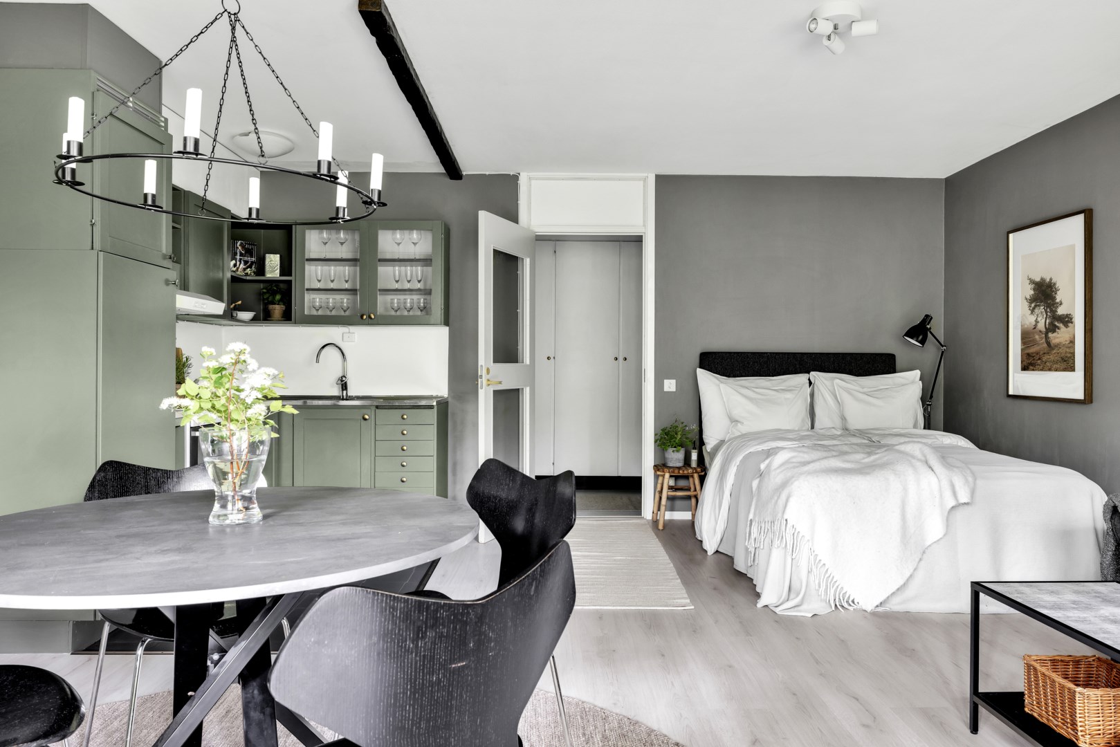 Lägenheten är genomtänkt inredd med ett rymligt vardagsrum där du enkelt får plats med både soffa, matbord, säng och arbetsyta. De stora fönstren vetter mot norr och släpper in ett vackert, mjukt ljus som skapar en behaglig atmosfär året runt – och håller bostaden härligt sval under sommaren.