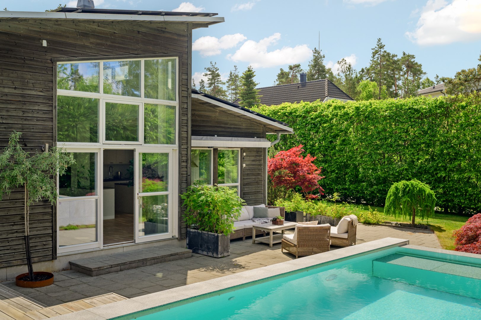 Kompromisslös villa från Willa Nordic med modern skandinavisk arkitektur. Elegant pool och trädgård!