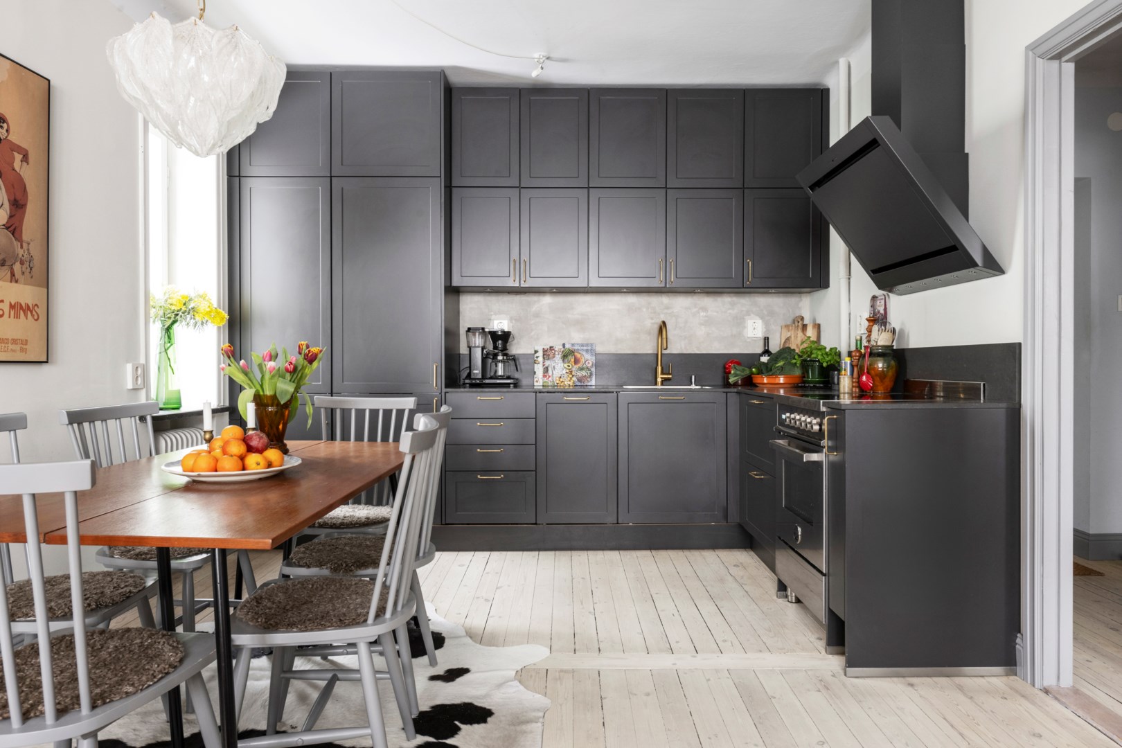 Köket från ALNO Scandinavia är verkligen en plats att trivas i. Med sina mörkgrå skåpluckor och mässingshandtag får det en stilren och modern känsla som ändå känns varm och hemtrevlig. De ljusa trägolven och det fina ljusinsläppet gör att rummet känns både ljust och luftigt. Här finns gott om plats för matlagning och förvaring, med smart planerade skåp och rejäla arbetsytor med bänkskivan i komposit. Den maskinella utrustningen består av integrerad kyl och frys, påkostad spis och ugn från Bertazzoni, kolfilterfläkt och naturligtvis finns här även en diskmaskin. Matplatsen intill rymmer både vardagens måltider och mysiga middagar med familj och vänner.