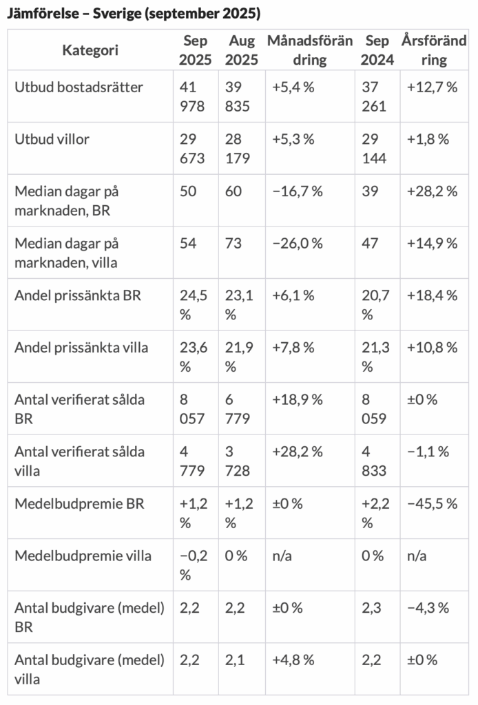 Den senaste statistiken från Svensk Mäklarstatistik och Booli visar att bostadsrättspriserna steg på riksnivå i september medan villapriserna backade marginellt. Den aggregerade bilden för Hela riket visar en försiktig men tydlig stabilisering av prisnivåerna, samtidigt som antalet genomförda affärer ligger högre än i fjol. Utvecklingen sammanfaller med Riksbankens räntesänkning den 23 september, vilket bidrar till ökad aktivitet och fler köpbeslut, särskilt i storstadsregionerna.