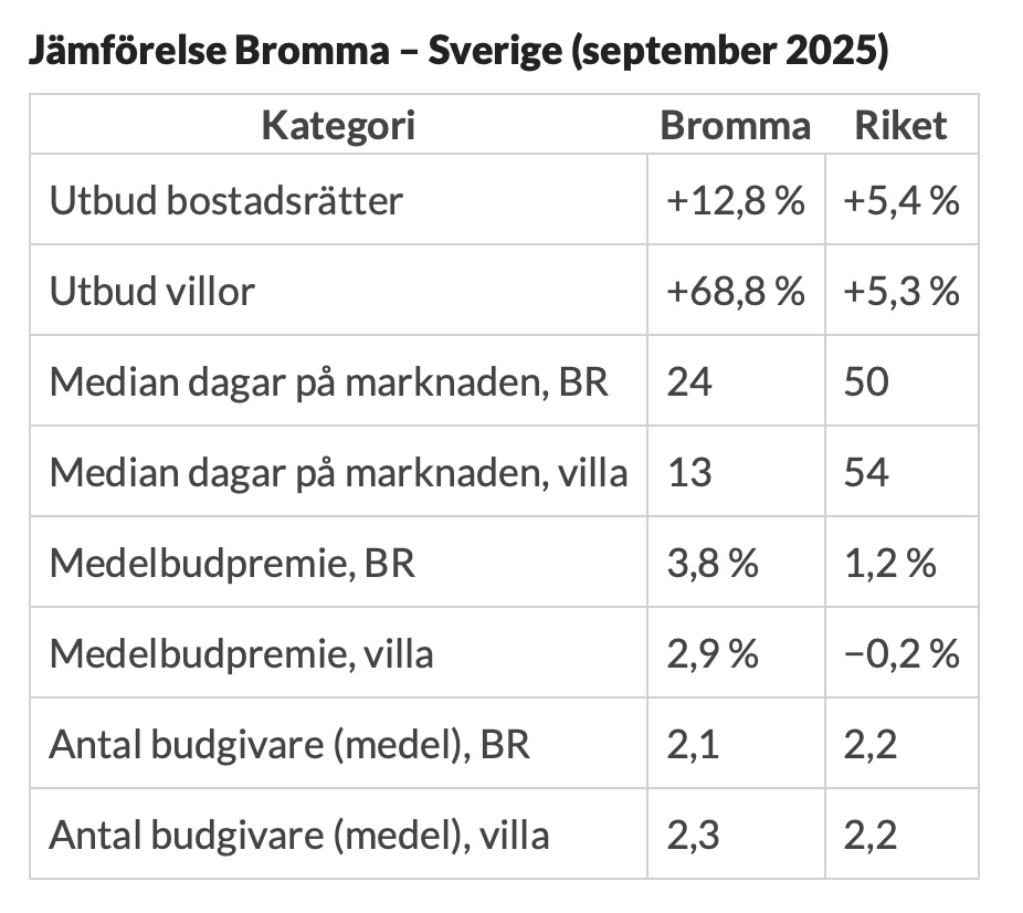 För Brommas del fortsätter området att attrahera köpare som söker trygghet, närhet till city och småskaligt boende. Debatten om Bromma flygplats framtid påverkar inte den kortsiktiga marknadsbilden, men visar att stadsdelen även på längre sikt står inför förändringar som kan påverka bostadsutbudet.