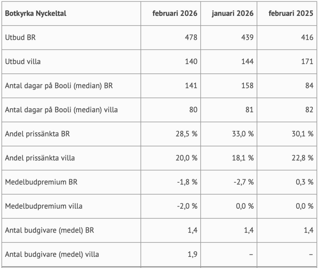 Februari visar flera konkreta tecken på att marknaden rör sig snabbare än i början av året, men på olika sätt i de två kommunerna. I Botkyrka minskar säljtiden för bostadsrätter jämfört med januari, samtidigt som budpremien är mindre negativ än månaden innan. I Salem går försäljningen av bostadsrätterna snabbare än i Botkyrka, men prisförhandlingen är tuffare, vilket syns i den mer negativa budpremien.